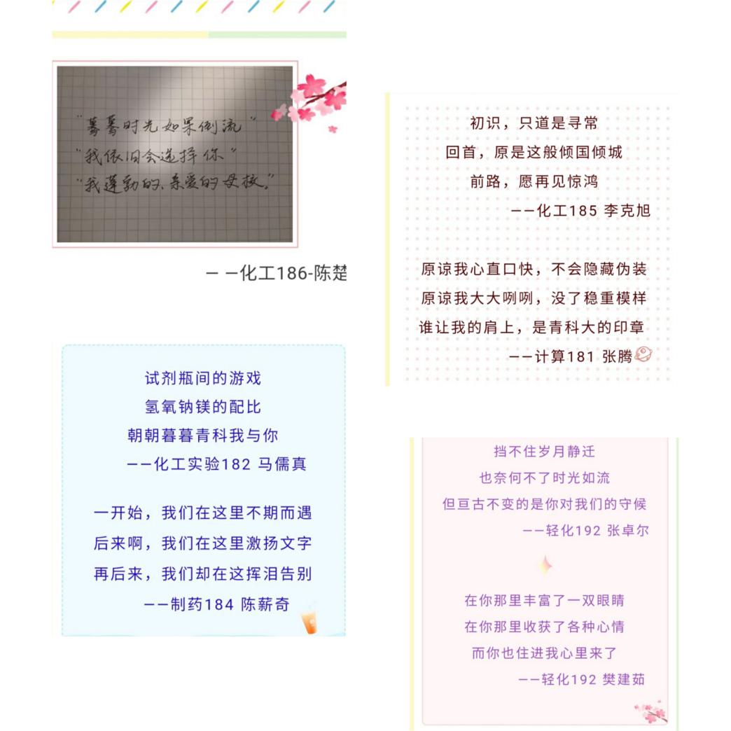 情诗虽短,却饱含着同学们沉积在心灵深处的感情,以情诗为介,或流露对开学的渴望,或遥寄对朋友的思念,或恭祝母校的七十华诞,或抑,或扬,或简单,或复杂。虽内容不同,手法各异,但都是自己内心最真实的写照,都表达了自己内心最真挚的情感。