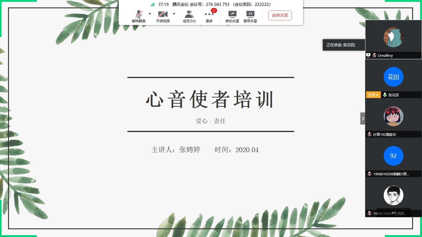 为进一步完善学校、学院、班级、宿舍“四级”工作体系建设,提高朋辈助人、自助能力,提升学生幸福指数,帮助心理委员、心音使者了解相关心理健康知识,4月21日下午,信息学院线上启动心音使者培训工作。由张惠保鑫老师主讲,分别对20162017、2018、2019级心音使者心理委员进行培训。