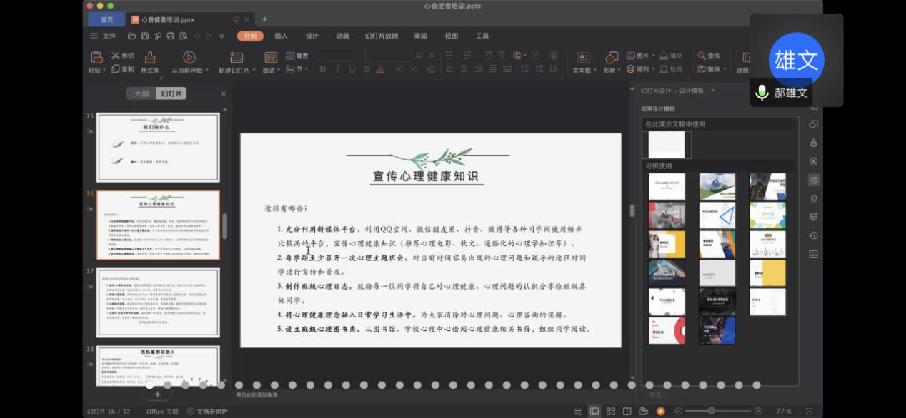 为落实学校心理中心通知要求,进一步加强学院学生心理自助和他助能力,提升心理干部知识技能水平,04月19日上午,化工学院心理工作站依托腾讯会议平台开展2020年度心音使者线上培训会。化工学院心理工作站老师王乐昌、郝雄文主持培训会议。