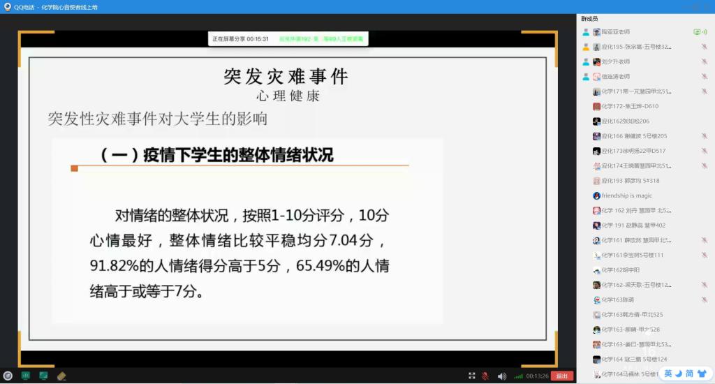 学院2016、2017、2018级共266心音使者参加了本次培训,涵盖学院本科生大二-大四的每间宿舍。会上,陶亚亚向同学们详细介绍了青岛科技大学心理危机四级预警防控体系实施细则,并结合现实情况,帮助同学们分析了新冠肺炎疫情对大学生的心理影响,在活动最后,她指出心音使者们明确自己的使命,学会观察、学会倾听、学会助人。闵繁盛利用一个小时的时间与心音使者就疫情之后的心理创伤教育、居家学习心理状态教育、目前阶段的焦虑顾虑等方面进行交流,特别就心音使者的职责和工作方法开展讲解。