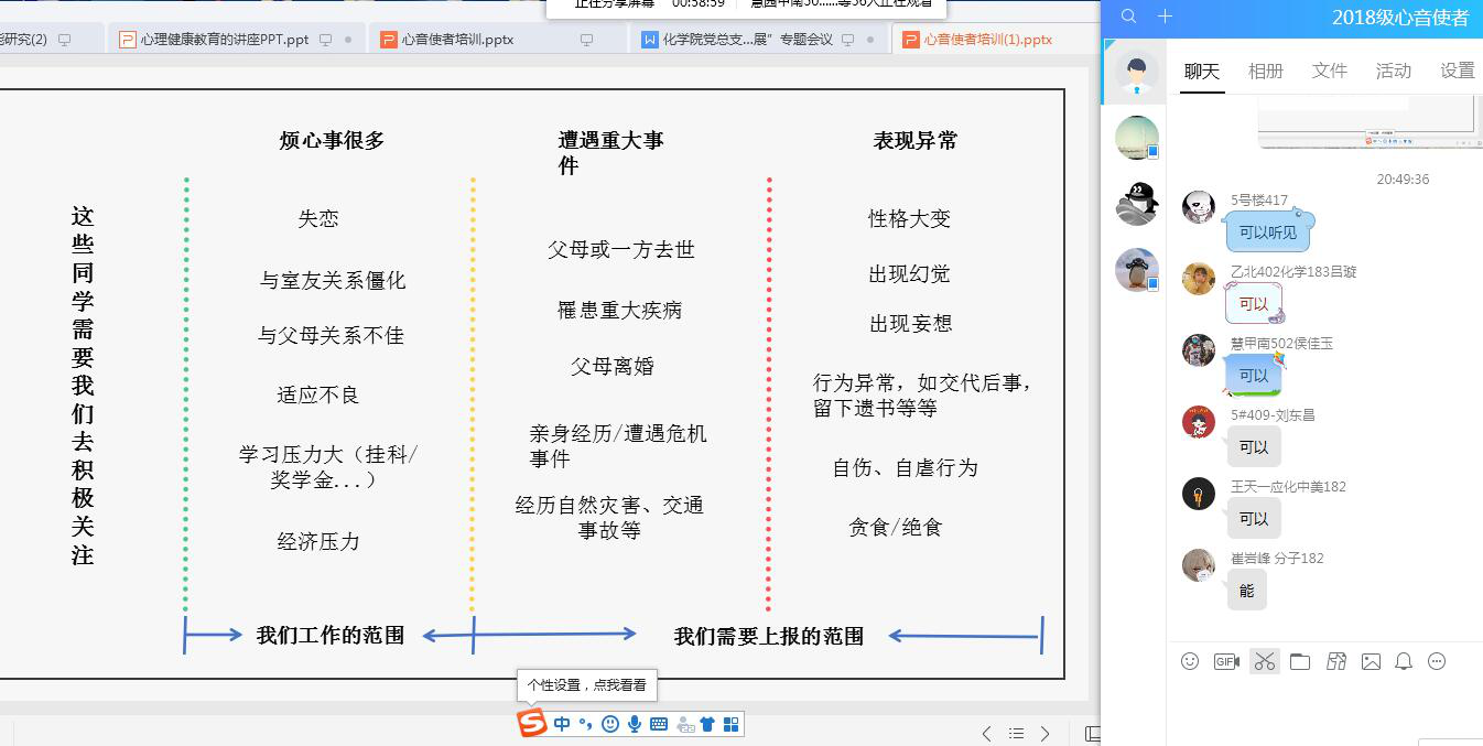 为进一步完善青岛科技大学学校、学院、班级、宿舍“四级”工作体系建设,提高心音使者的责任意识,更好地发挥引导作用。化学院于4月15日下午开展了两场“心音使者”线上培训活动,化学院辅导员闵繁盛、陶亚亚担任主讲老师。