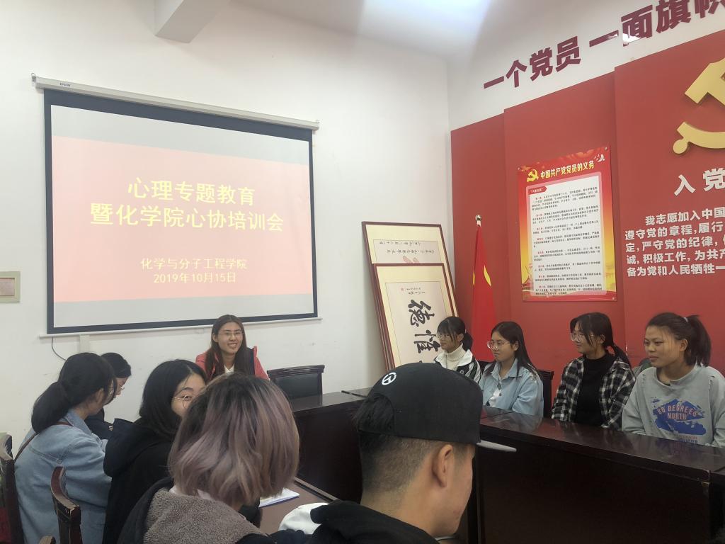 10月15日,化学院在1政227室举行心理健康协会心理专题教育暨化学院心协培训会,学院心理工作站站长刘施施老师主持会议。