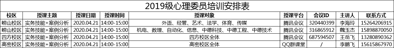1.心理中心负责对2019级心理委员进行实务技能的培训,详见表1;