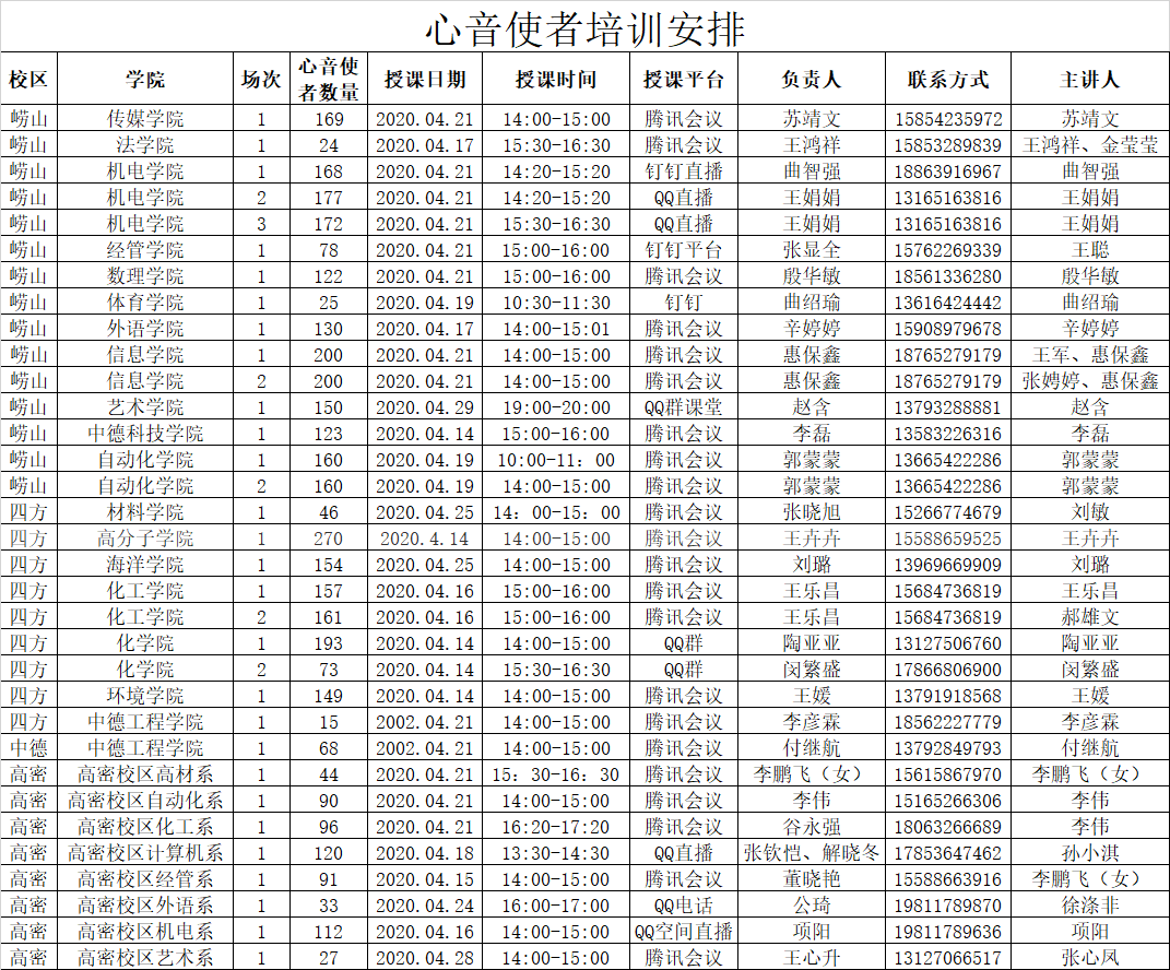 为进一步完善青岛科技大学学校、学院、班级、宿舍“四级”工作体系建设,提高朋辈助人、自助能力,提升学生获得感、幸福感、安全感,计划启动本学期心理委员、心音使者培训工作,具体事宜通知如下: