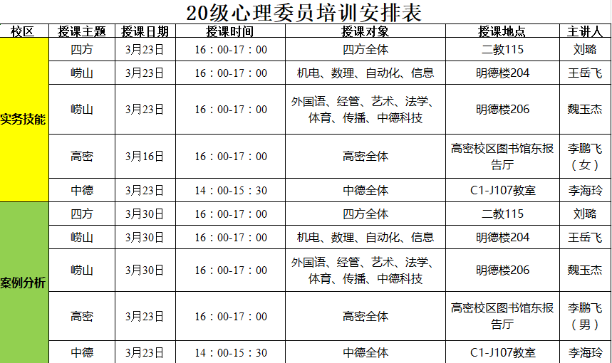 1.心理中心负责对2020级心理委员进行实务技能的培训,具体安排详见下表,请通知相关学生按时参加