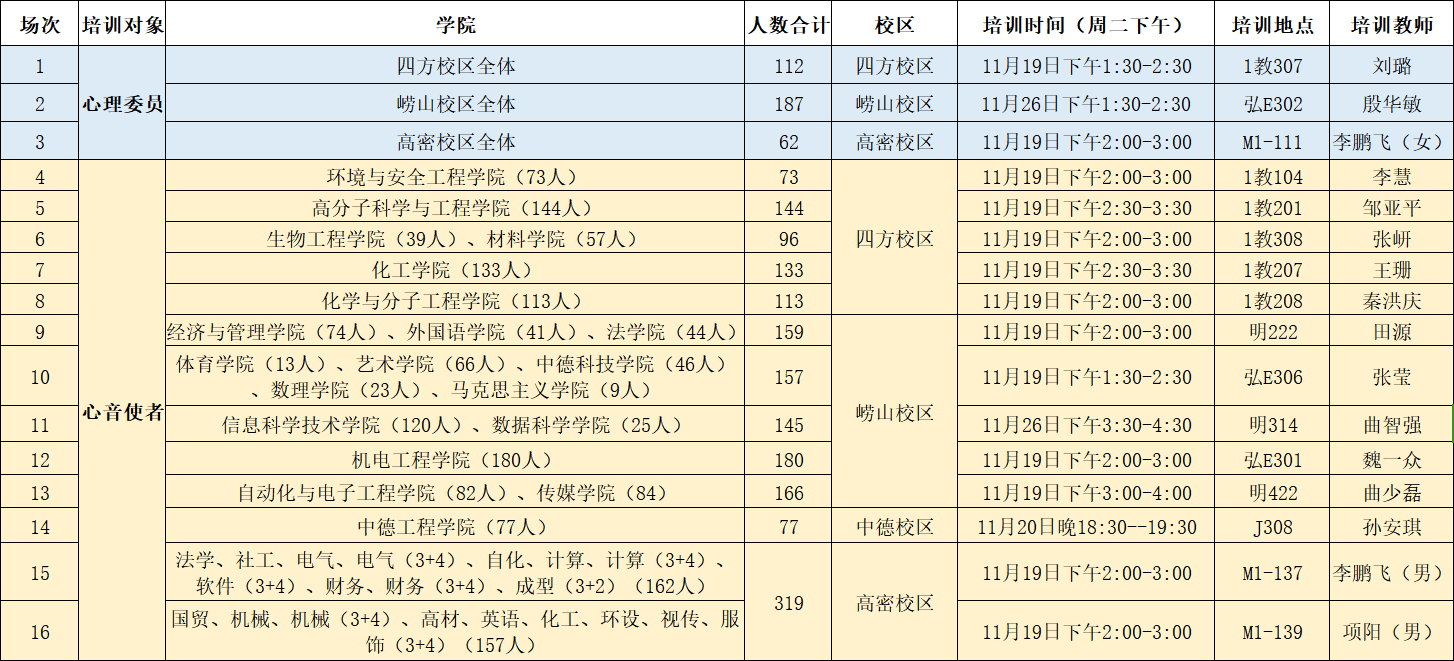 由心理健康教育与咨询中心(以下简称心理中心)制定,联合各学院、校区具体组织实施培训工作。