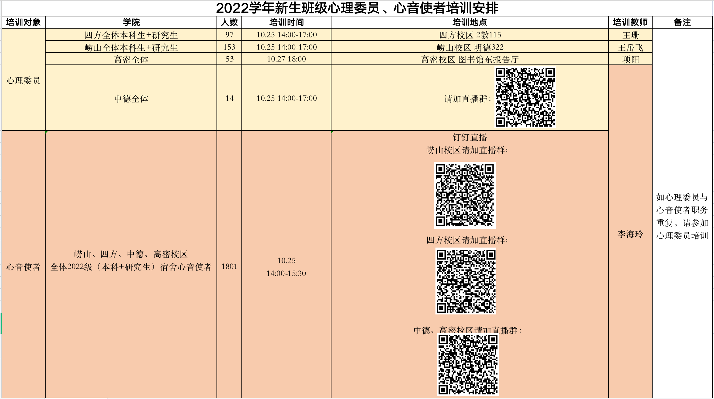 心理中心安排专业教师对2022级心理委员、心音使者进行实务技能的培训,具体时间、地点、参与人员见下图。