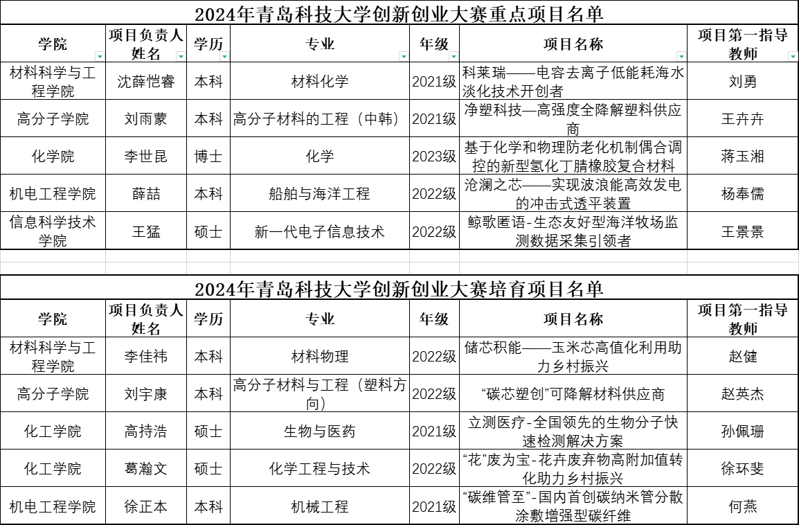 关于公布2024年青岛科技大学创新创业大赛首批重点项目和培育项目名单的公示
