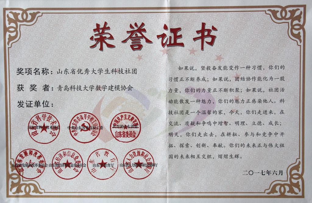 青科大数学建模协会荣获“山东省优秀大学生科技社团”荣誉称号