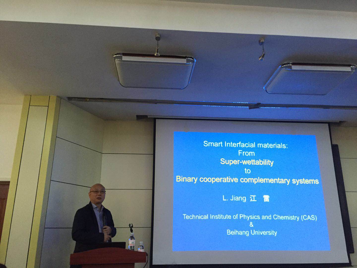 报告中,江雷院士以毛泽东“有所发现、有所发明、有所创造”的哲学思想为中心,引用多位哲学大家的思想,同时结合众多著名科学家的研究成果,就自己的研究领域和科研历程做了形象而又深刻的描述。江雷院士从自然界中拥有智能超浸润体系的动植物出发,结合个人的研究工作和哲学思考,详细地介绍了从超浸润到时空调控的二元协同作用,并系统地总结了近年来仿生多尺度界面材料领域的研究工作;然后,他简要介绍了基于超浸润体系新的研究工作和新的知识体系,使大家对该领域未来的研究方向有了一个清晰的认识;最后,江雷院士与在座师生就相关问题进行了交流与探讨。