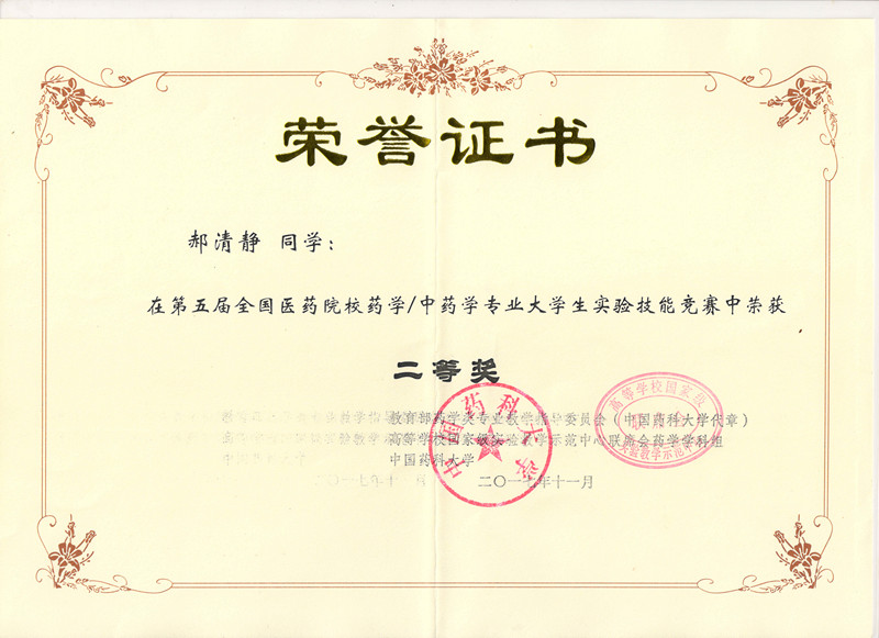11月8日至10日,由教育部高等学校药学类专业教学指导委员会、高等学校国家级实验教学示范中心联席会药学学科组和中国药科大学联合主办,中山大学药学院承办的“第五届全国医药院校药学/中药学专业大学生实验技能竞赛”,化工学院制药141班郝清静喜获全国二等奖,制药144班李婷获得全国三等奖。