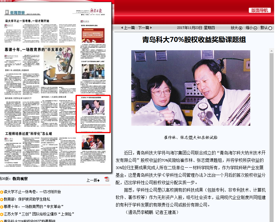 为努力适应转方式、调结构的新形势,激发广大教师参与科技成果转化的积极性,增强科研人员的获得感,形成创业的良好风气,根据中央办公厅《关于实行以增加知识价值为导向分配政策的若干意见》及山东省相关文件精神,并按照青岛科技大学《学科性公司管理办法》中对科技成果入股权益及分配的相关规定,学校研究决定将“青岛海尔科大纳米技术开发有限公司”股权收益的70%奖励给课题组,并将学校所获收益的30%划归主要成果完成人所在二级单位——材料学院所有,作为学院科研产业发展基金。