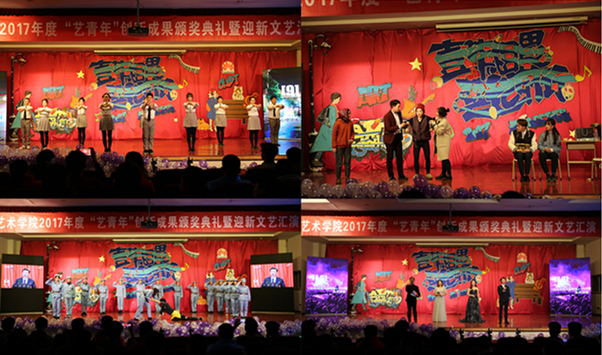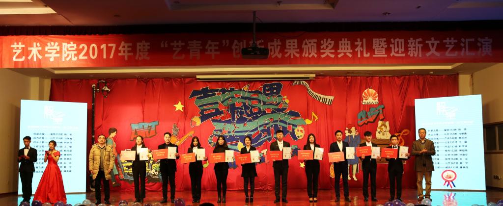 为深入学习贯彻党的十九大精神,树先进典型,展青春朝气,凝聚发展正能量,12月19日晚,以“壹柒相遇.兿起前行”为主题的艺术学院2017年度“艺青年”创新成果颁奖典礼暨迎新文艺汇演在崂山校区第二报告厅举行。校领导王文哲,建安集团、学生处、校团委、艺术学院相关人员及各教研室主任、分团委老师与各年级学生代表800余人共同参加了颁奖典礼并观看了演出。