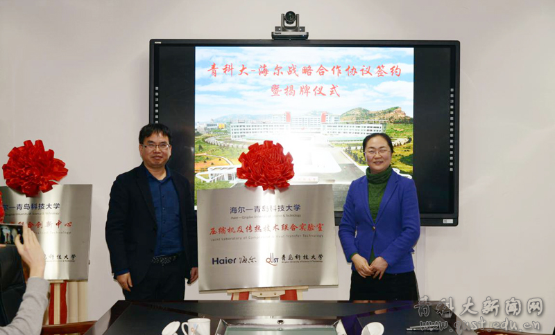 12月27日下午,青岛科技大学与海尔集团战略合作协议签约暨联合实验室揭牌仪式在图书馆楼5004室举行。青岛科技大学副校长刘光烨、海尔副总裁王晔出席仪式,代表双方签约并为海尔-青岛科技大学“超前技术联合创新中心”揭牌,机电学院院长何燕与海尔超前创新中心总监马国军为“压缩机及传热技术联合实验室”揭牌。