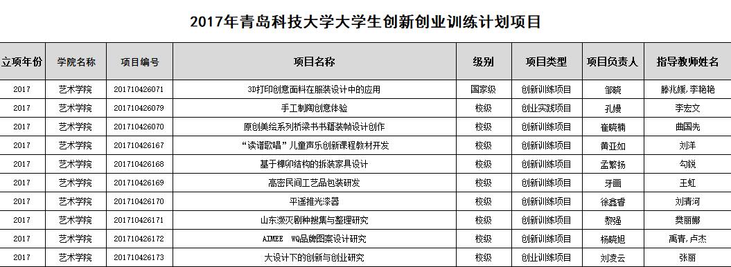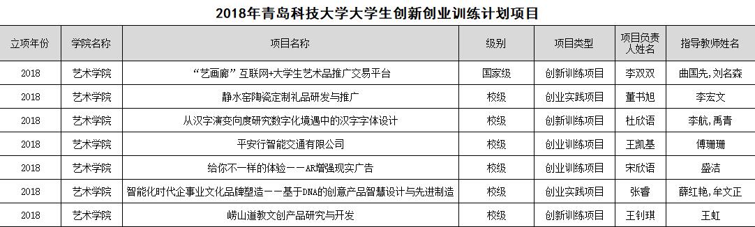 1.大学生创新创业训练计划项目立项申报工作。艺术学院组成由院长、书记任组长、主管教学副院长和主管学生工作副书记任副组长的创新创业领导小组,制定了《艺术学院关于大学生创新创业立项实施办法》。2017年学院组织申报大学生创新创业训练计划项目共计13项,获批国家级创新创业项目1项,校级大学生创新创业训练计划项目9项,10项创新创业训练计划项目均已成功完成结题验收;2018年学院组织申报大学生创新创业训练计划项目共计11项,获批国家级创新创业项目1项,校级大学生创新创业训练计划项目6项。