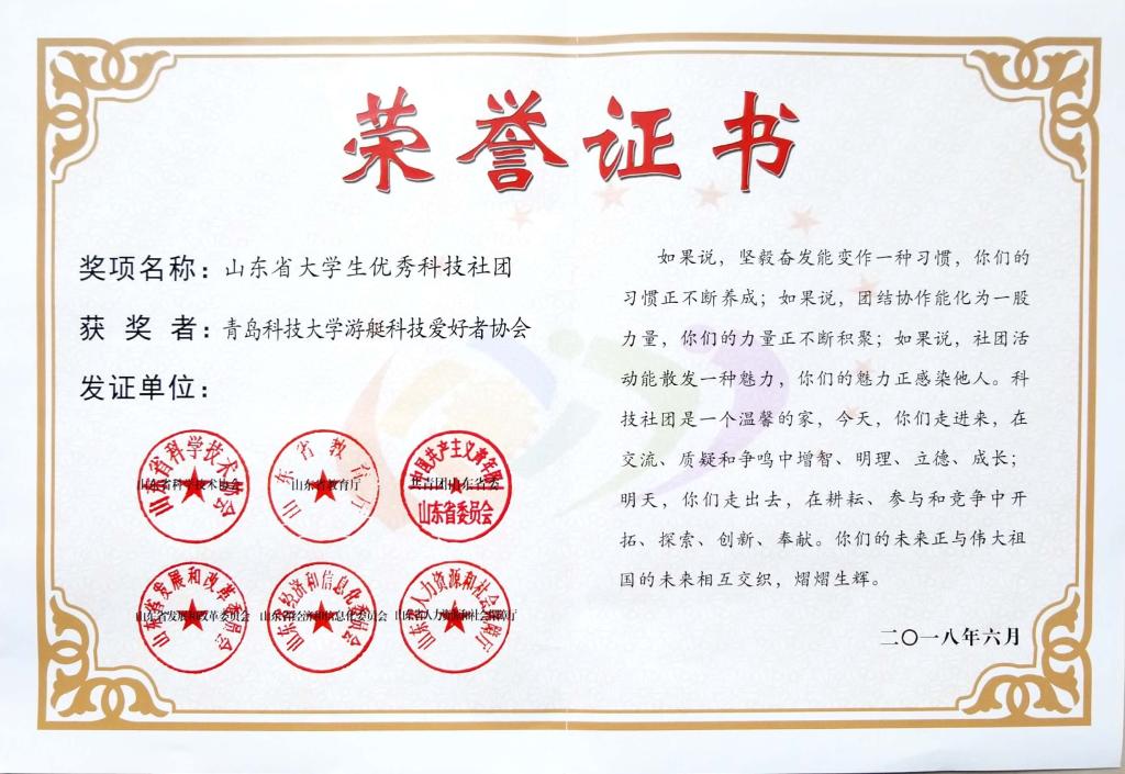 日前,山东省科学技术协会下发《关于公布2018年山东省大学生优秀科技社团和优秀科技社团干部评选结果的通报》(鲁科协发[2018]27号),对来自全省各高校共计77个科技社团和125名科技社团干部进行表彰,青岛科技大学游艇科技爱好者协会荣获“2018年山东省大学生优秀科技社团”,青岛科技大学科技创新协会会长毕晅晨、青岛科技大学化工学院科技创新协会副会长轩辕书天荣获“2018年山东省大学生优秀科技社团干部”荣誉称号。