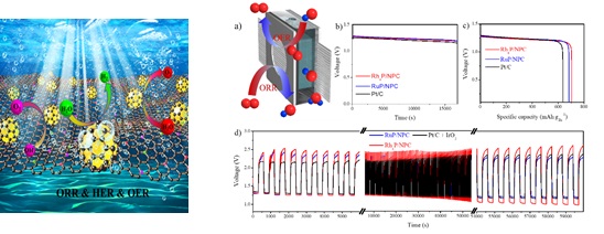 该团队建立于2017年6月,研究方向为光电催化能源器件关键反应,例如HER,OER和ORR, 以及其他小分子活化,例如二氧化碳和氮气还原等。该团队制备的低负载贵金属电催化剂,铑和钌的含量分别为0.4 wt% 和 0.5 wt%,催化剂表现了优异的三功能性能,尤其是氧气还原和氢气析出反应,按照质量活度计算,铑和钌催化剂的性能分别是铂碳50~100倍。此两种电催化剂组装的锌-空电池和水裂解池,性能优于贵金属Pt/C 和 IrO2组装的电池,有潜在规模化应用前景。该成果为替代传统高活性贵金属电催化剂,减少贵金属用量开辟了新的途径。