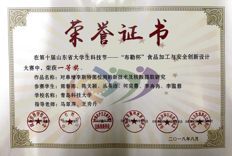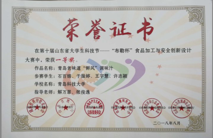 近日,第十届山东省大学生科技节——“布勒杯”食品加工与安全创新设计大赛在中华全国供销合作总社济南果品研究院众创空间举行,中国海洋大学、山东农业大学、青岛大学、青岛科技大学等29所高校在内的279支队伍参加了大赛,最终86个项目进入决赛。青岛科技大学海洋科学与生物工程学院解万翠、张俊逸和马翠萍、王秀丹老师指导的两件作品荣获一等奖。