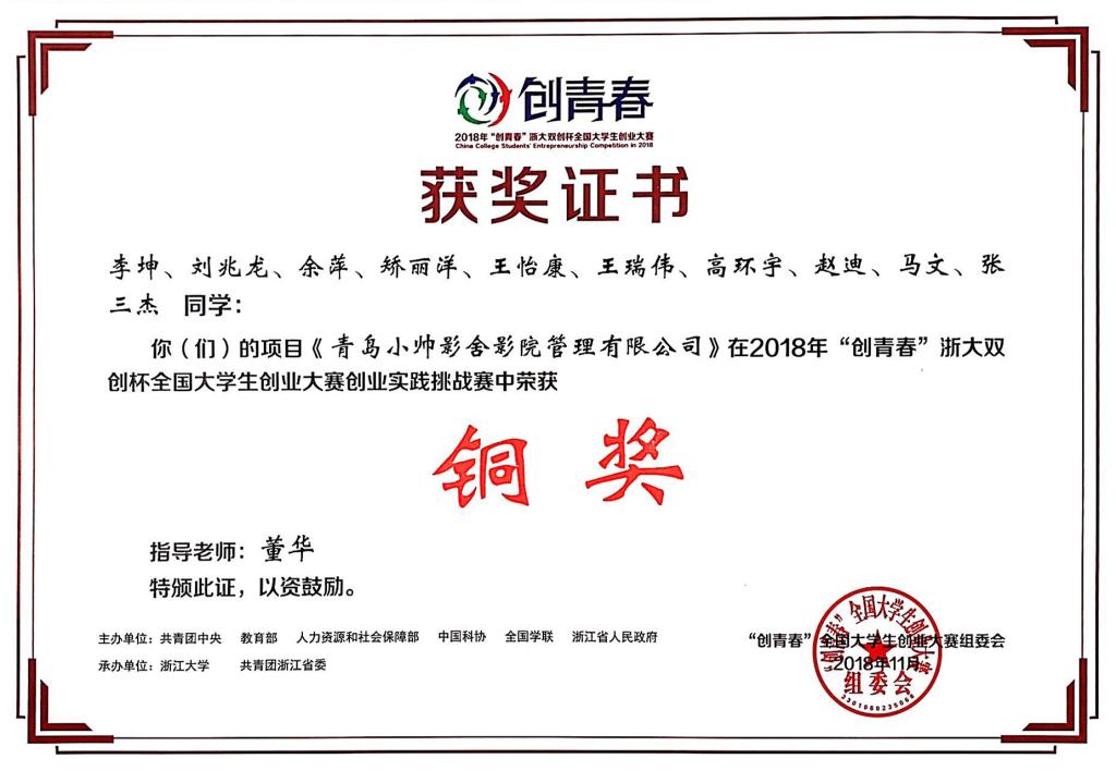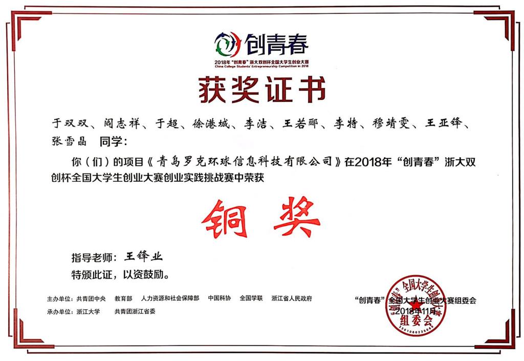11月3日,“创青春”浙大双创杯全国大学生创业大赛在浙江大学落下帷幕。我校推送的作品《青岛罗克环球信息科技有限公司》和《青岛小帅影舍影院管理有限公司》获得创业实践挑战赛铜奖。本次大赛由共青团中央、教育部、人力资源社会保障部、中国科协、全国学联、浙江省人民政府主办,浙江大学、共青团浙江省委承办。