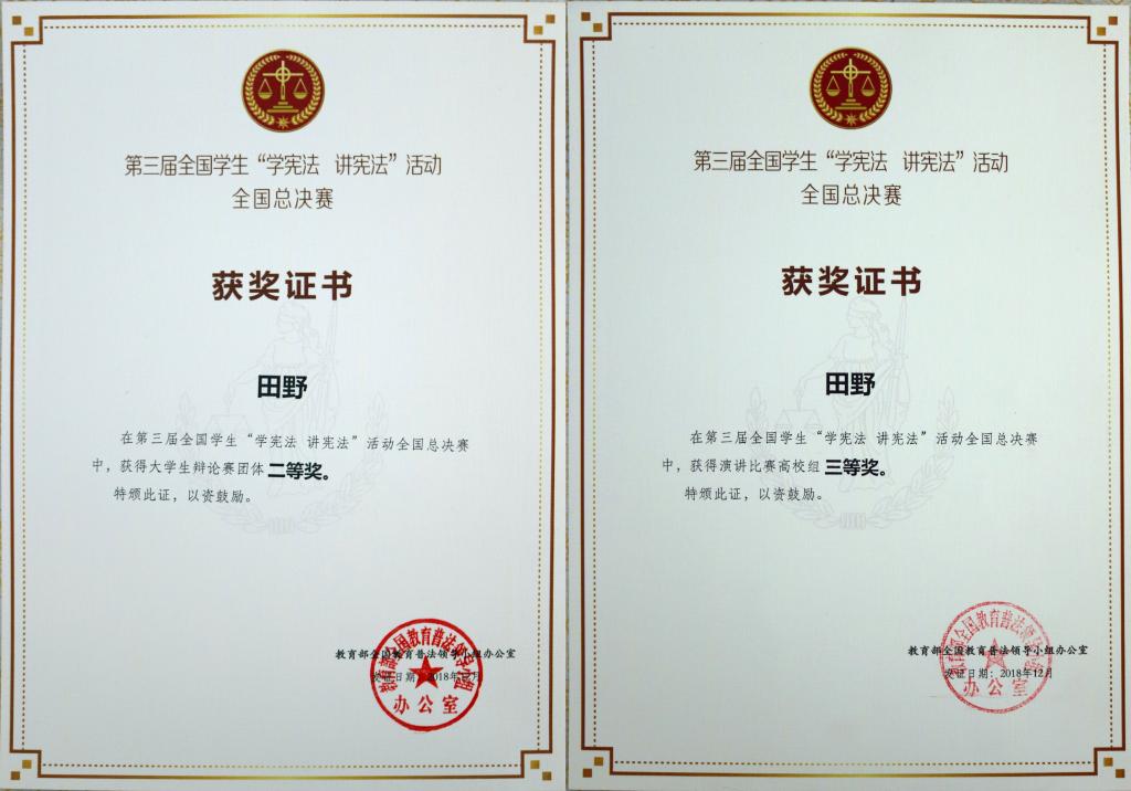 比赛前期,田野经过选拔入选山东省高校组四人代表队,并作为山东省唯一代表参加演讲比赛,与来自中国人民大学、浙江大学、南开大学等全国各高校的37名选手参加了比赛,获高校组三等奖。与此同时,作为“学宪法 讲宪法”活动大学生辩论赛山东省队队员,田野与省队其他三名成员经过三个月的认真备赛,在全国总决赛中表现优异,获大学生辩论赛团体二等奖。