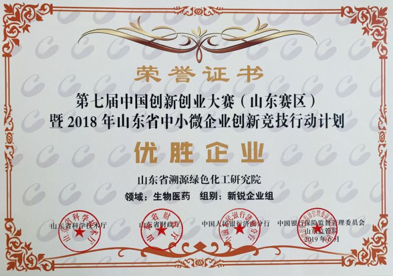 山东省溯源绿色化工研究院在2018年山东省中小微创新竞技行动计划中,夺得生物医药领域新锐企业组第一名。山东艾孚特科技有限公司在2018年山东省中小微创新竞技行动计划中,夺得生物医药领域精英企业组第一名,并在推荐参加的第七届中国创新创业大赛总决赛中位列第五名,荣获三等奖,是该赛事2014年以来山东省参赛企业(不含青岛市)获得的最佳成绩。