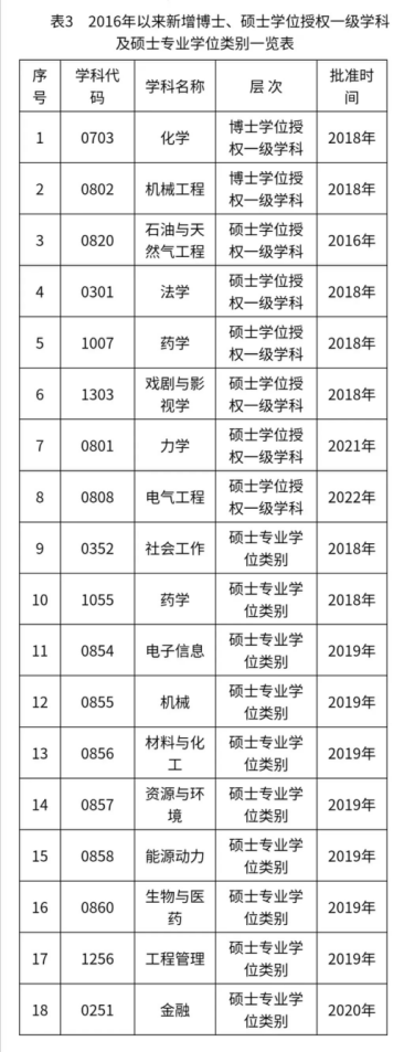 自2016年以来,学校获批化学、机械工程2个博士学位授权一级学科,法学、药学、戏剧与影视学、力学、电气工程5个硕士学位授权一级学科,社会工作、药学2个硕士专业学位类别。在工程硕士专业学位授权点对应调整工作中,将12个工程领域调整成电子信息、机械、材料与化工、资源与环境、能源动力、生物与医药、工程管理7个专业学位类别。学校坚持“有所不为”原则,主动撤销发展前景不好的精密仪器及机械、情报学2个硕士学位授权点,对应调整增列石油与天然气工程、金融2个硕士学位授权点(表3)。截至目前,学校共有5个博士学位授权一级学科,24个硕士学位授权一级学科,16个硕士专业学位类别,实现了各教学学院硕士一级学科授权点全覆盖。