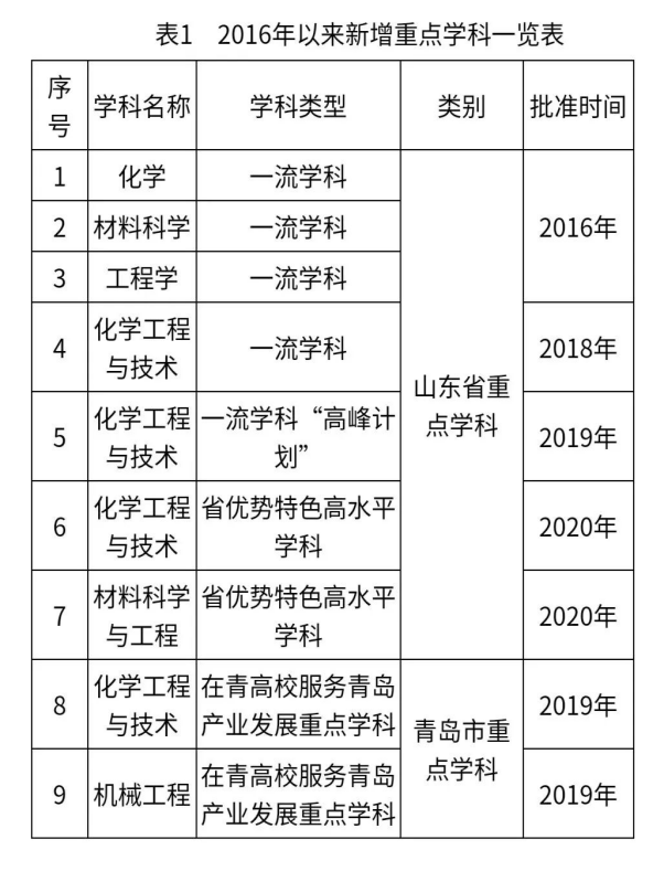 2016年化学、材料科学、工程学3个学科入选山东省重点建设“一流学科”行列;2018年化学工程与技术入选省一流学科,并于2019年入选省一流学科“高峰计划”A类学科;2020年化学工程与技术、材料科学与工程2个学科入选山东省“优势特色”类高水平学科,学校入选山东省“强特色”类高水平大学;2019年化学工程与技术、机械工程入选在青高校服务青岛产业发展重点学科(表1)。目前我校US News世界学科排名上榜7个学科,化学工程与技术位列第102位。在全国第四轮学科评估中,学校有9个学科进入前70%,其中化学工程与技术为B+,省属高校工科唯一(表2)。
