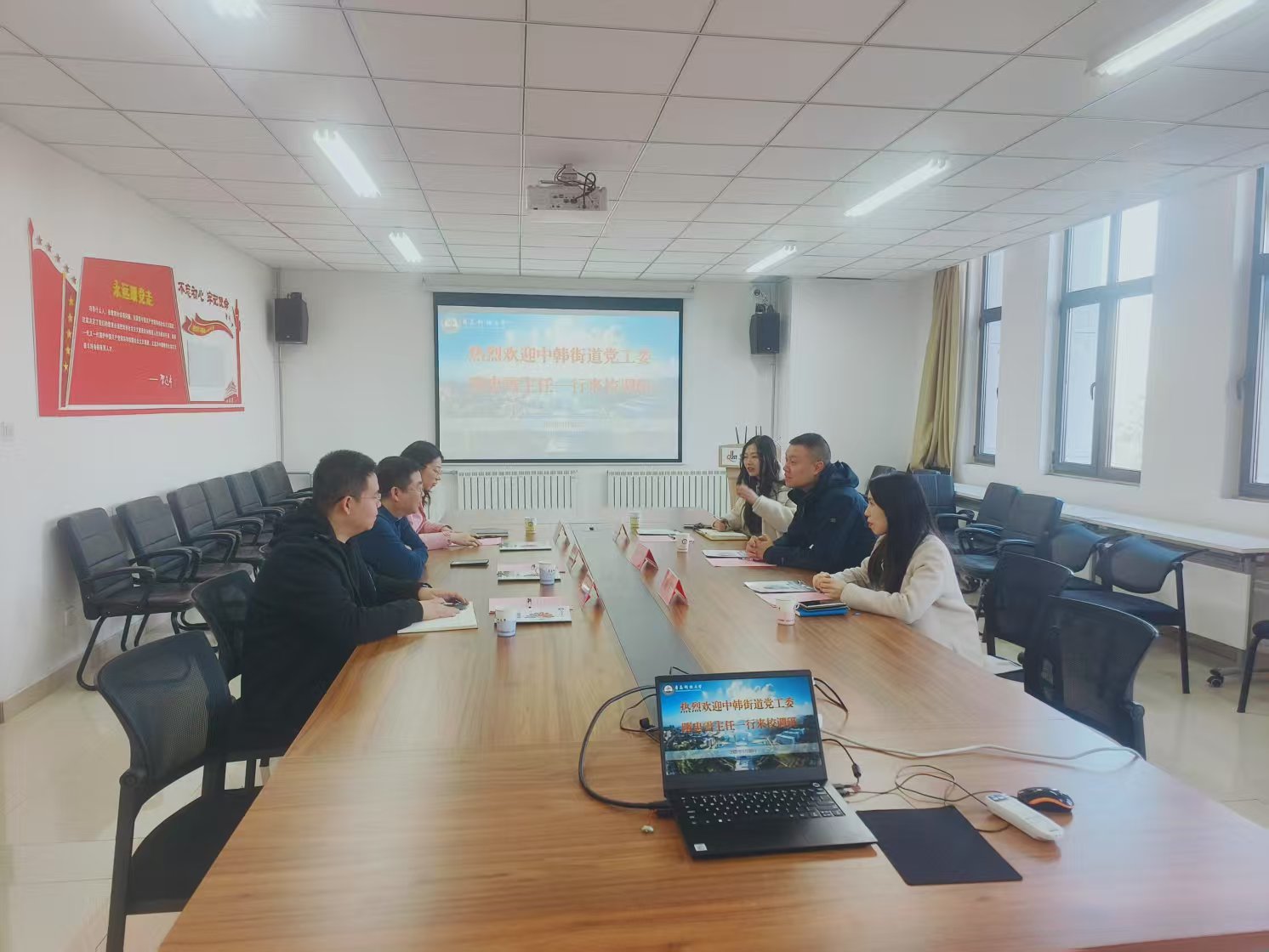 3月20日上午,崂山区中韩街道党工委组织委员、党建办公室主任隋忠雪一行来校调研学校创新创业教育工作开展情况,在三创中心212会议室座谈。会议由创新创业教育学院常务副院长褚庆柱主持。
