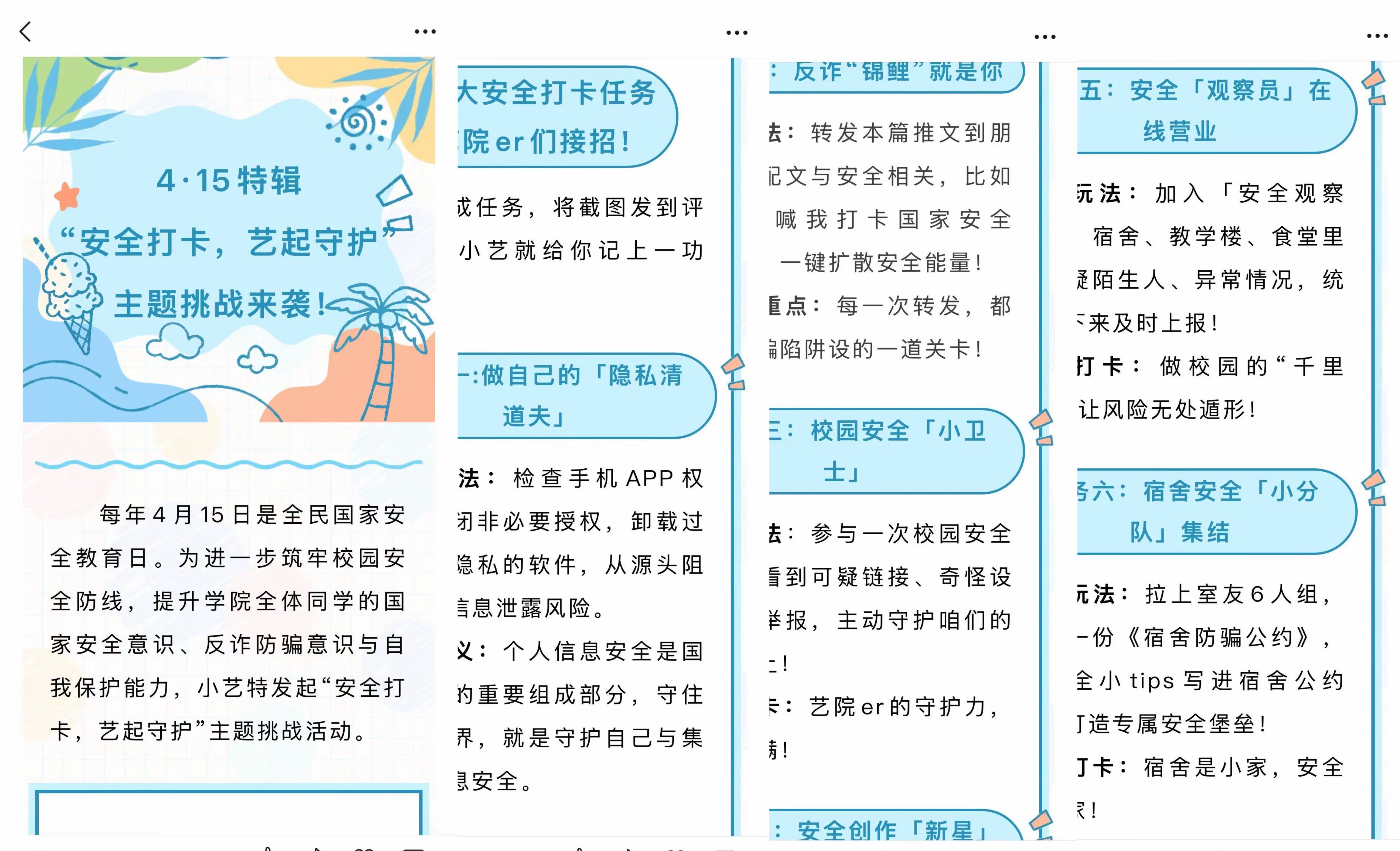 创意打卡聚合力,守护安全你我他。艺术学院创新形式,线上发起“安全打卡,艺起守护”主题挑战活动,邀请全院学生参与打卡挑战,设置六大安全打卡任务,包括检查手机应用权限保护个人信息、参与校园安全巡逻、创作安全主题短视频、与室友共同制定《宿舍防骗公约》等。通过趣味化打卡,提升互动性和参与性,引导青年学子以实际行动守护家国平安。