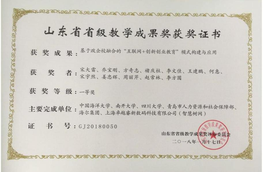 山东省省级教学成果奖一等奖:基于政企校融合的“互联网+创新创业教育”模式构建与应用