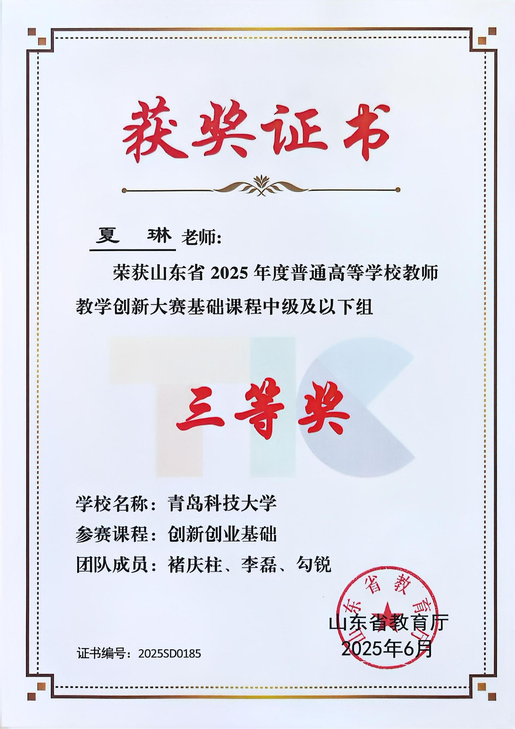 2025年度山东省普通高等学校教师教学创新大赛三等奖