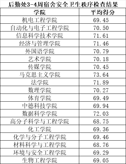 根据学校工作安排,后勤管理处组织公寓管理人员开展崂山、四方校区3-4周宿舍安全卫生秩序检查。本次共检查宿舍5712间,经统计,合格及以上宿舍5506间,不合格宿舍206间。各学院平均得分如下所示。