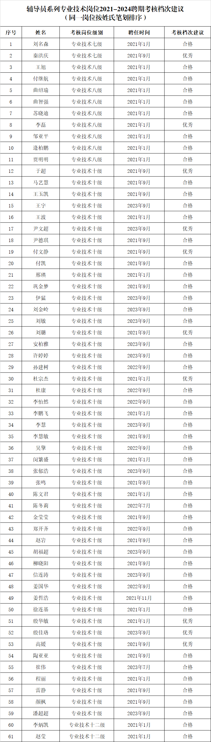 关于辅导员系列专业技术岗位2021-2024聘期考核档次建议的公示