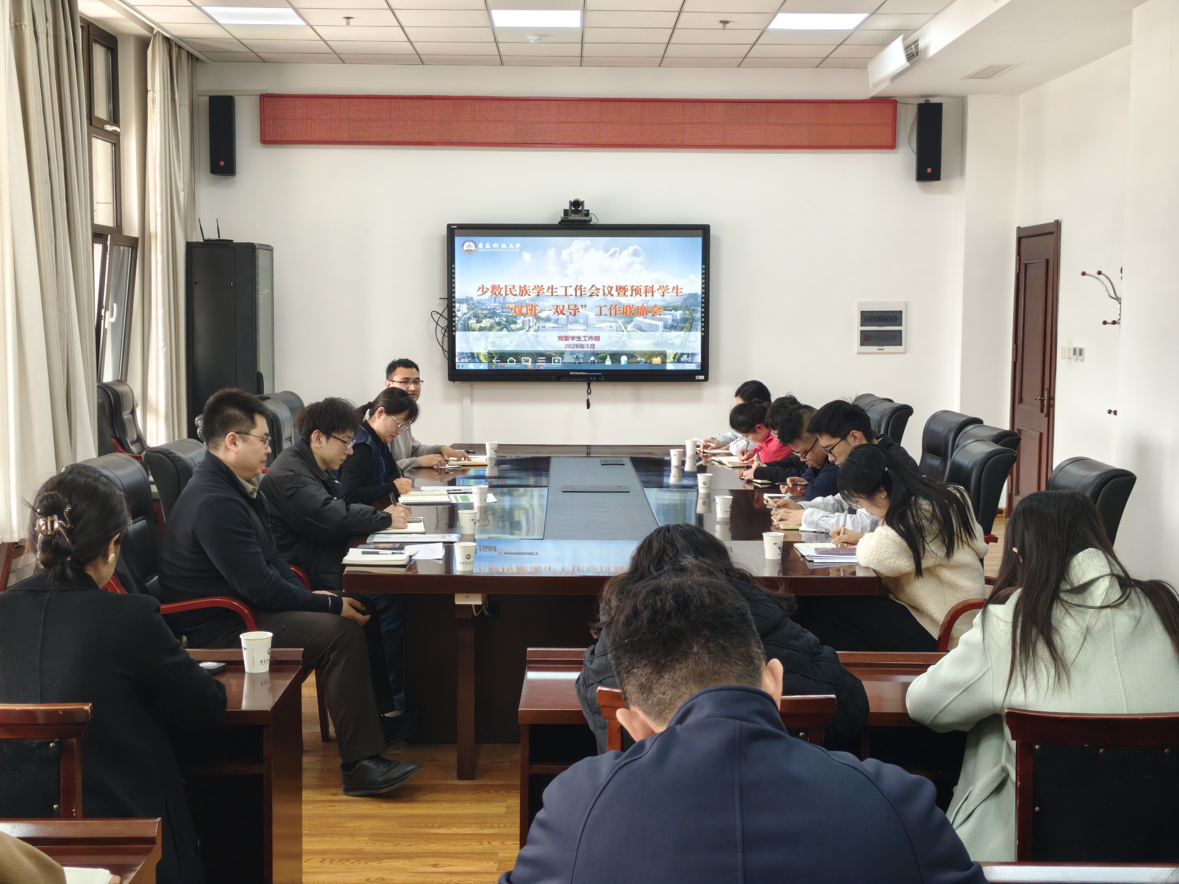3月26日下午,学校在崂山校区综合楼2015会议室组织召开少数民族学生工作会议暨预科学生“双班一双导”工作联席会。党委学生工作部副部长尤亭亭出席会议,会议由少数民族专职辅导员凯撒尔主持。