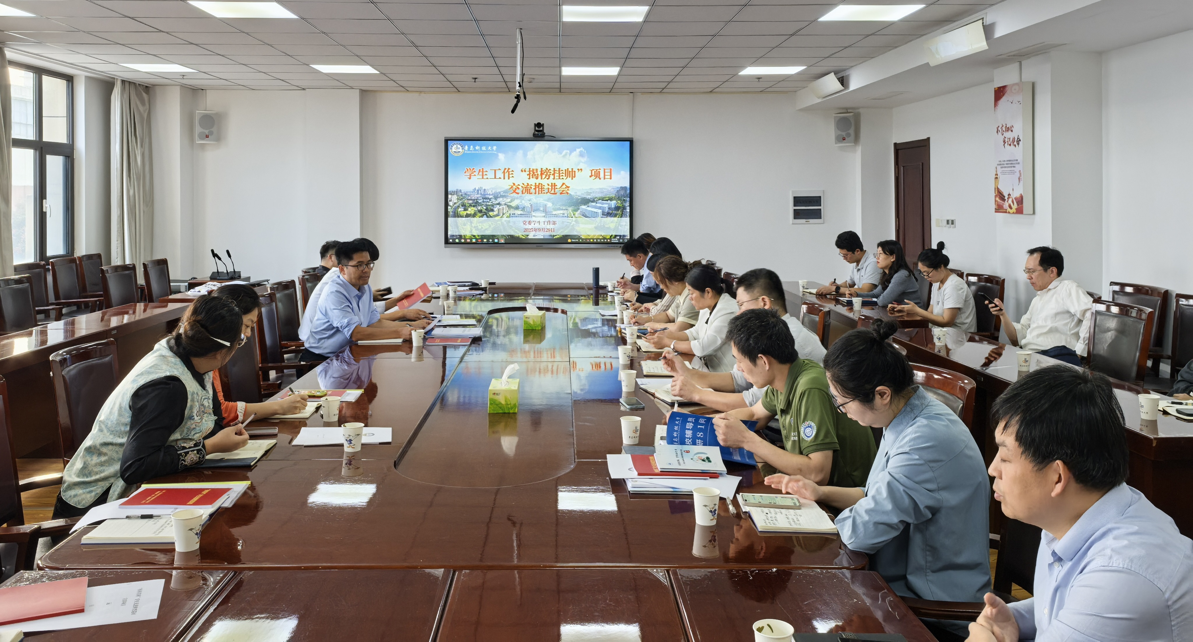9月29日,学校在崂山校区综合楼3015会议室召开2025年度学生工作“揭榜挂帅”项目第二次建设推进会。党委学生工作部相关负责同志、各项目负责人及团队骨干成员参加会议。