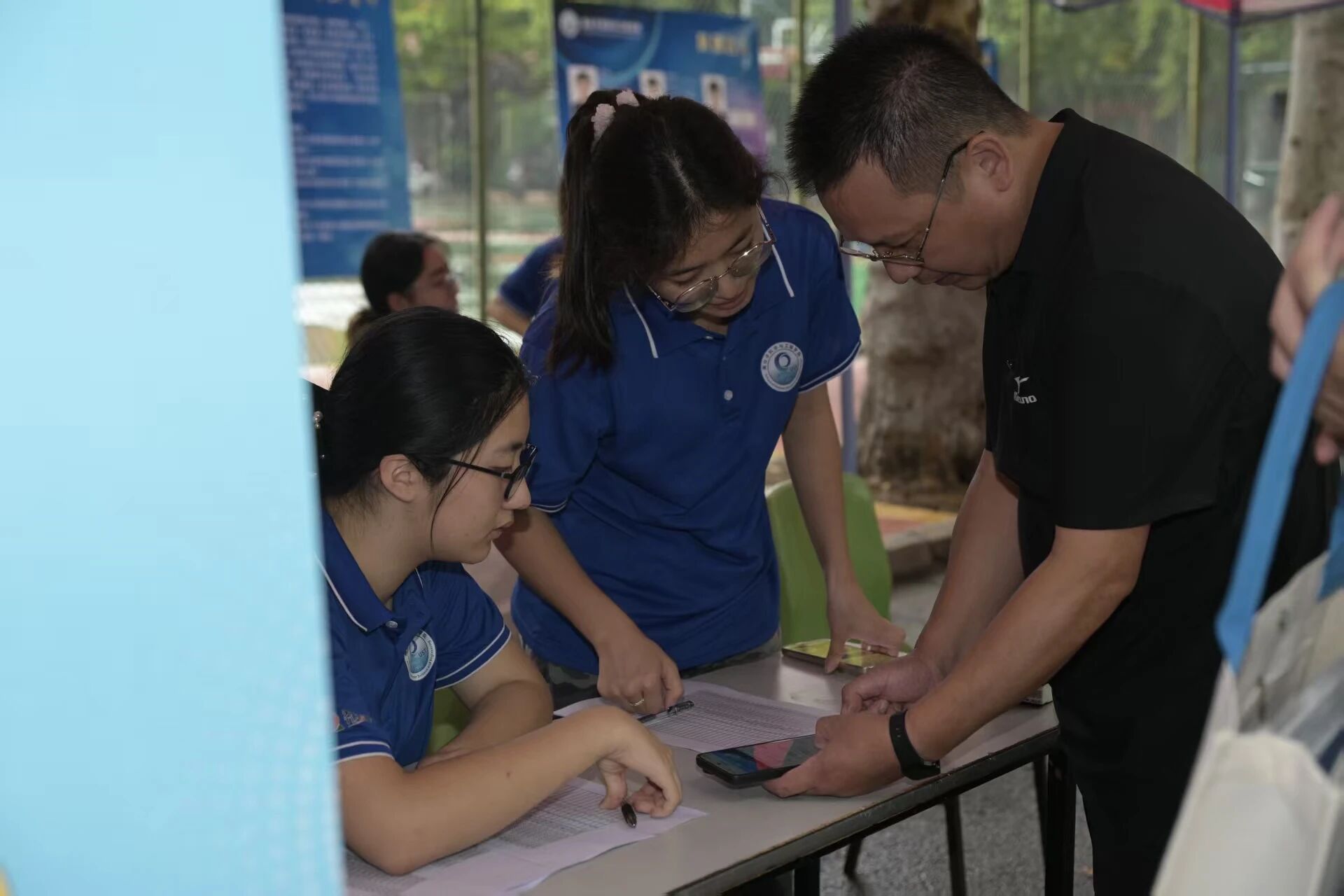 科学划分核心报到区、家长休息区、特色互动区及应急服务与保障区四大功能区域,全方位覆盖迎新全场景需求。核心报到区设置身份核验、材料收取、绿色通道及信息咨询窗口,以“一分钟内对接、三分钟内办结”为标准,高效办理入学手续,其中绿色通道窗口还发放宣传册,助力家庭经济困难新生无忧入学。家长休息区配备座椅、免费矿泉水及遮阳设施,同步设置咨询交流角,方便家长等候并了解学院情况;创新开展“以新迎新”特色活动,将“迎新”升华为“迎心”,精心选拔并组织了一批2025级新生加入志愿者团队,让他们从“被迎接者”转变为“迎接者”,让新生志愿者在服务中提前融入集体,培养了归属感、责任感和领导力,同时也向全体新生传递了高分子学院薪火相传、互助友爱的“橡尚”精神,成为迎新现场一道充满活力的风景线。特色互动区及应急服务与保障区,志愿者在此引导流程、传递“橡尚”精神。如材料体验区域通过实物展示增强新生专业认知,拍照打卡区设置了青春快闪照”橡“馆,提供打印照片服务;现场设有的“党员先锋岗”和“应急协调员”,及时处理各类个性化问题,让新生在踏入校园的第一时间就感受到学院严谨专业的组织能力和温暖周到的人文关怀。