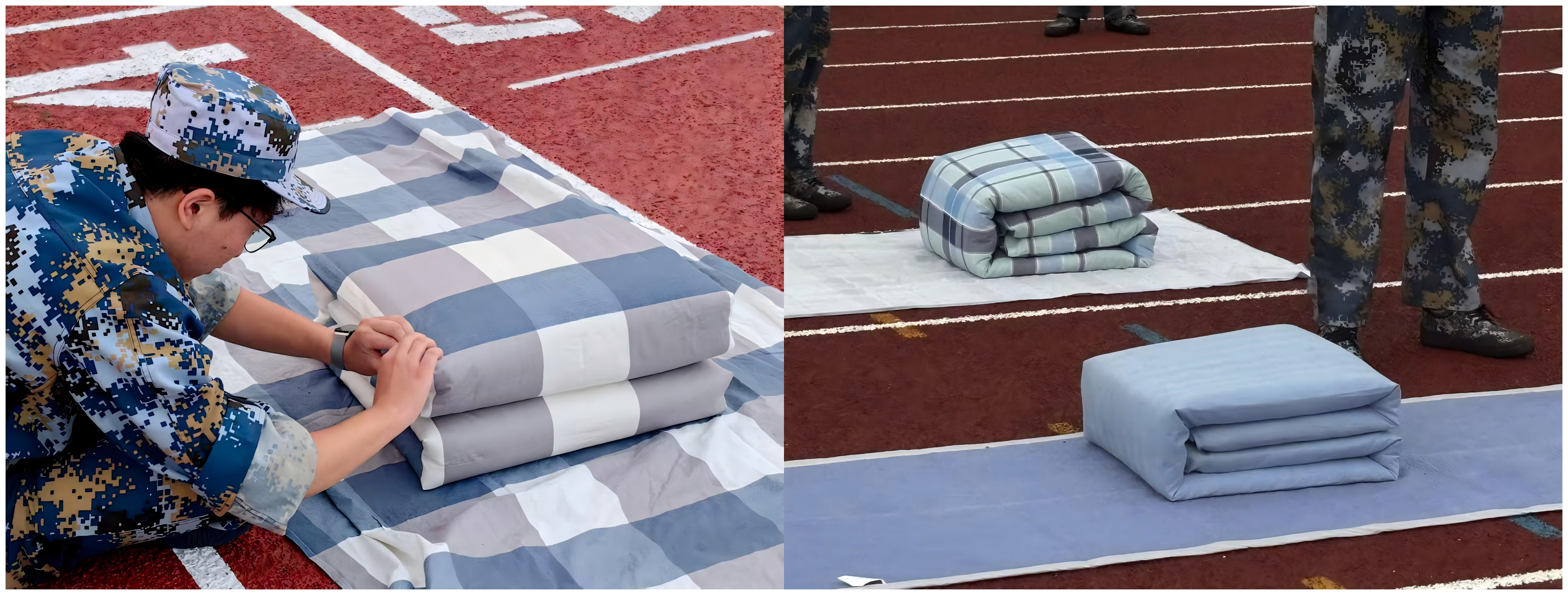 以赛促建,军事竞赛激发迷彩热情。军事技能竞赛作为巩固军训成果、延续优良作风的重要抓手,通过设置歌咏、内务等集体性与生活化项目,有效激发了学生的参与热情,并将训练场上的纪律意识与拼搏精神延伸至第二课堂与团队建设中。“军歌嘹亮·凝聚人心”歌咏比赛以连排为单位组织,比赛中激昂的旋律、整齐的和声与富有创意的表现形式,不仅充分展现了团队的昂扬风貌,更在反复排练与协作过程中进一步增强了集体归属感和凝聚力。军训成果的转化不仅需要集体精神的共鸣,更需落实到日常行为的细节养成。校区同步开展聚焦生活习惯塑造的内务整理竞赛,以“豆腐块”式军被等成果展示赛,通过照片、视频等形式呈现宿舍整体环境。该活动有力推动了军训内务标准向日常生活的转化,促进学生形成整洁有序的良好生活习惯。