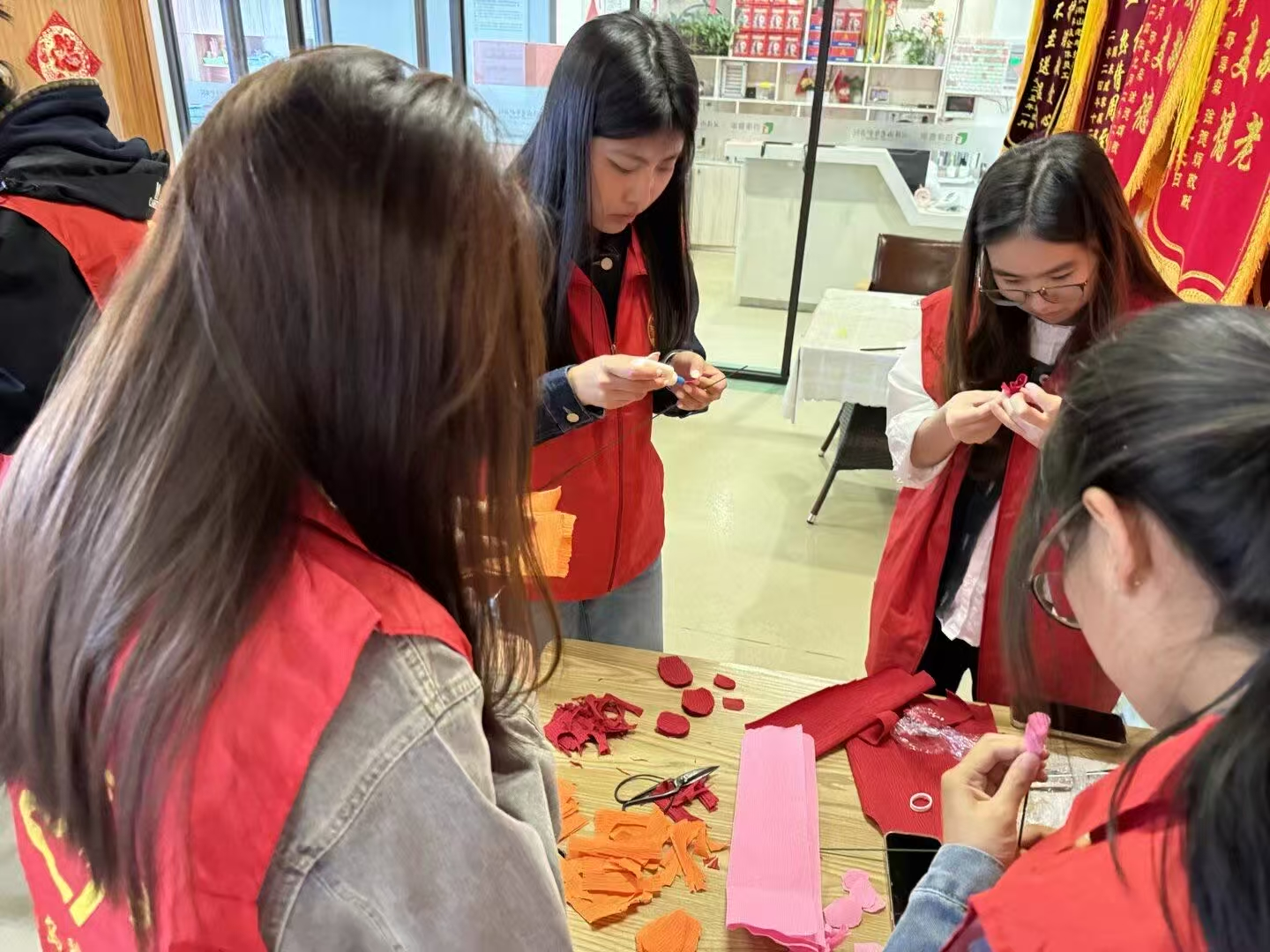 随后,在室内活动区,一场充满传统文化趣味的剪窗花活动热烈展开。志愿者们将准备好的红纸、剪刀分发给老人们,并耐心细致地进行讲解和协助。虽然许多老人是初次尝试,但在同学们手把手的帮助下,他们逐渐掌握了技巧,一张张普通的红纸在手中变幻出各式各样寓意吉祥的窗花图案。老人们兴致勃勃地展示着自己的作品,脸上洋溢着孩童般的喜悦与成就感。
