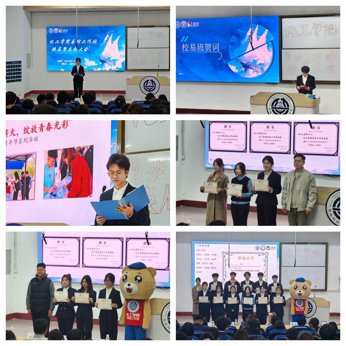 11月4日下午,化工学院易班工作站2024-2025年度换届暨表彰大会于第二教学楼101室顺利召开。学院学工办副主任柳晓阳,学院易班工作站指导老师赵建滕,校易班代表,环境学院、生物工程学院易班代表,以及化工学院易班工作站全体成员参加本次会议。