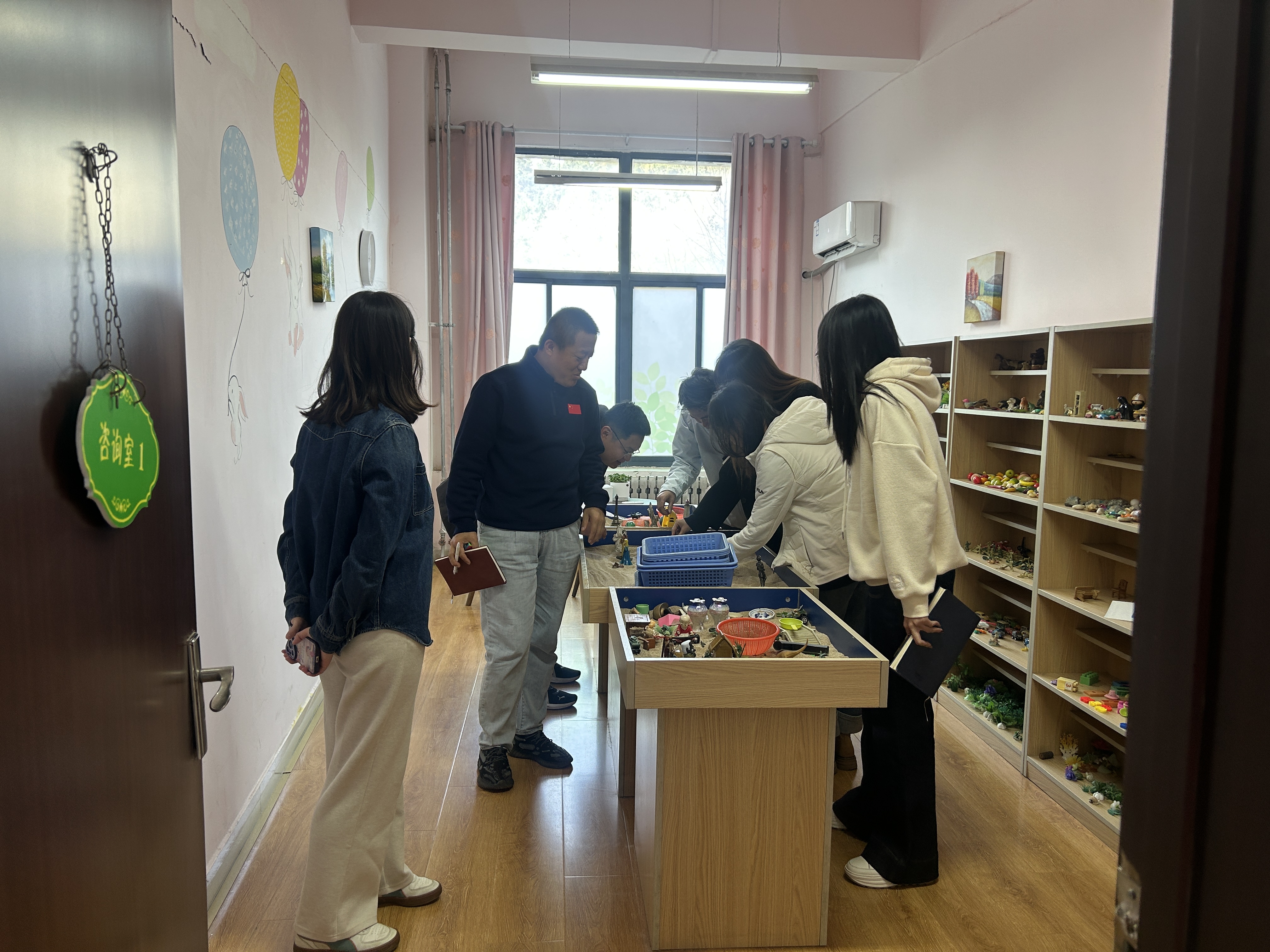 会后,心理健康教育与咨询中心刘璐老师向与会辅导员介绍了心理访谈室、心理中心走廊文化和沙盘模拟,以及心理团辅室。