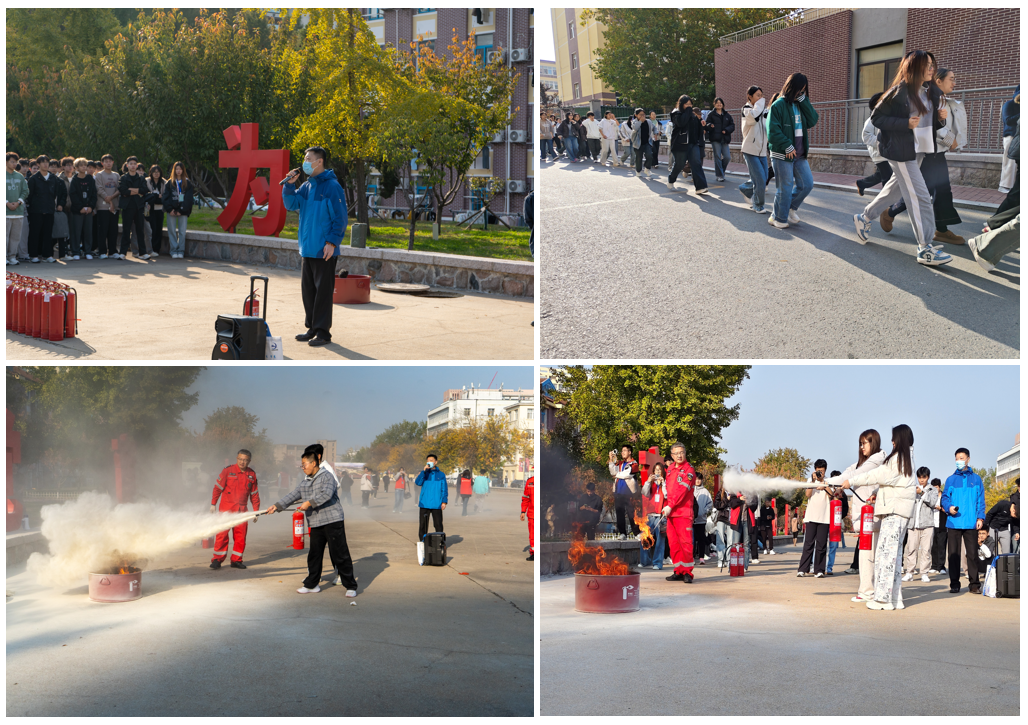 下午15时,消防演练正式开始。宿舍楼内,同学们闻声而动,在各学院辅导员与学生志愿者的引导下,捂住口鼻,弯腰低姿,按照预定疏散路线快速有序撤离。从宿舍楼道到楼梯转角,再到楼外安全通道,整个撤离过程紧张而有序,无拥挤、无慌乱。抵达小五四广场指定安全区域后,仇立峰现场开展消防安全实训,他结合校园火灾案例,深入浅出地讲解了火灾成因、初期火灾扑救、火场逃生技巧等核心知识,重点介绍了干粉灭火器的使用原理与“提、拔、握、压”四字操作法。“压下压把时要对准火焰根部,保持安全距离匀速喷射……”在仇立峰的示范指导下,学生代表轮流上前实操,亲身体验灭火器灭火过程,直观感受消防安全技能的实际应用。学生们纷纷表示,从疏散撤离到灭火器实操,全程沉浸式的体验让消防安全知识从“书本”走进“实践”,印象格外深刻。