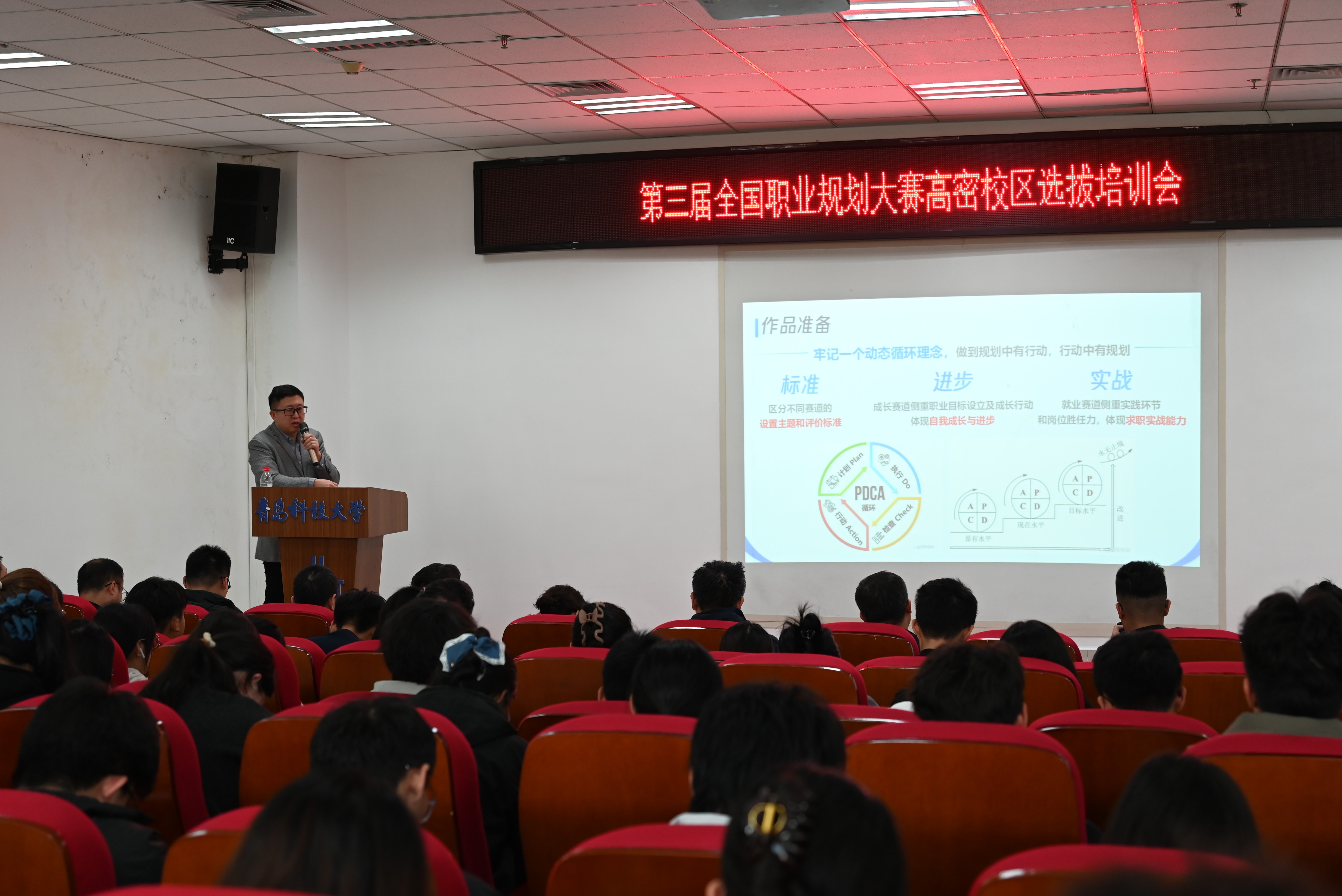 为帮助学生精准把握第三届全国大学生职业规划大赛备赛方向,提升学科竞赛参与质量,11月13日下午,高密校区举办第三届全国职业规划大赛校区选拔培训会。全国及省级职规赛、创新大赛评委解恒岩受邀主讲。校区党委副书记王作辉出席会议,各专业参赛学生代表、竞赛指导教师参会。