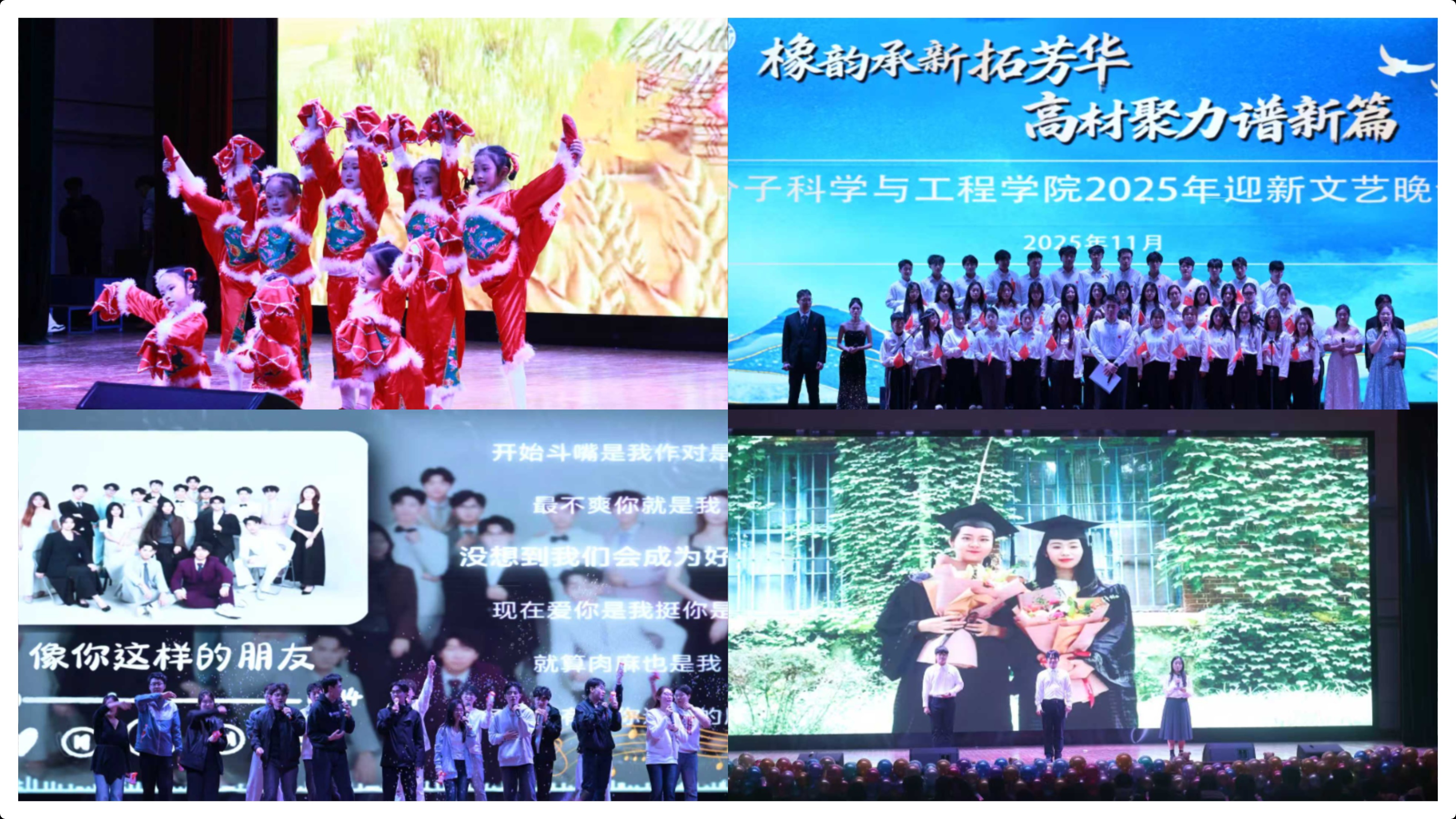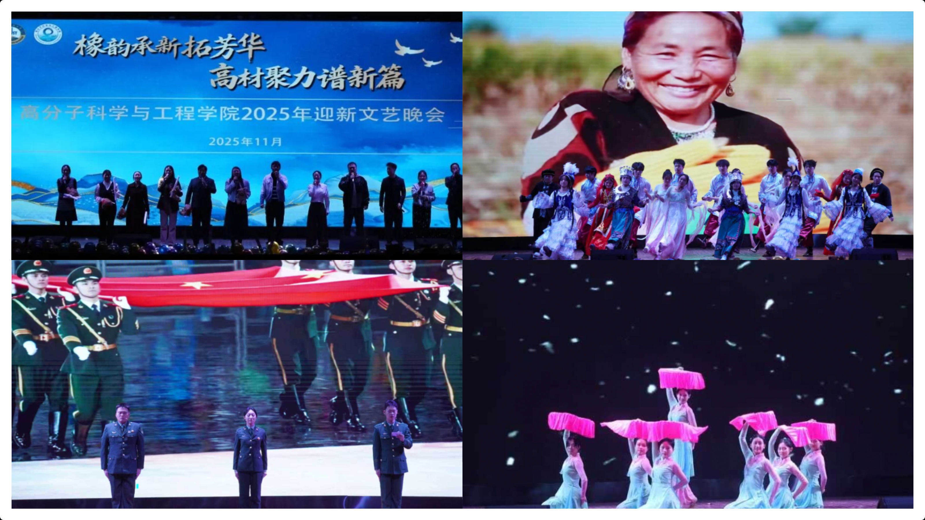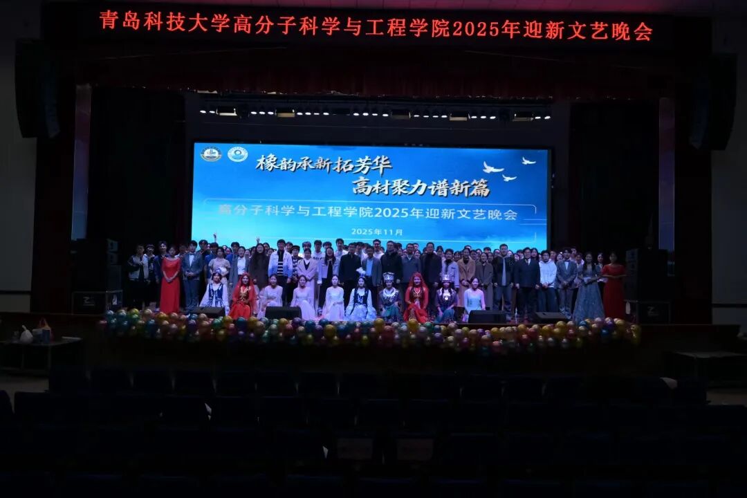 为深入学习贯彻党的二十届四中全会精神,扎实推进校园文化建设和思想政治教育工作,11月21日晚,高分子学院“橡韵承新拓芳华,高材聚力谱新篇”2025级迎新晚会在西礼堂隆重举行。学院党委书记宣宗伟、副院长王庆富、党委副书记兼副院长贾明明出席活动,2025级班主任代表及全体辅导员共同参与,与新生齐聚一堂,共上一堂融思想性、艺术性、教育性于一体的"文艺思政课"。