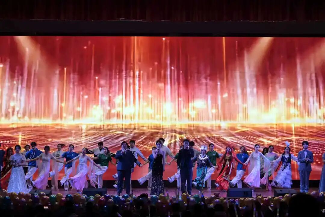 晚会最后,师生同台演绎《相亲相爱》,在温暖旋律中展现学院师生团结一心、砥砺前行的精神风貌,将现场气氛推向高潮。