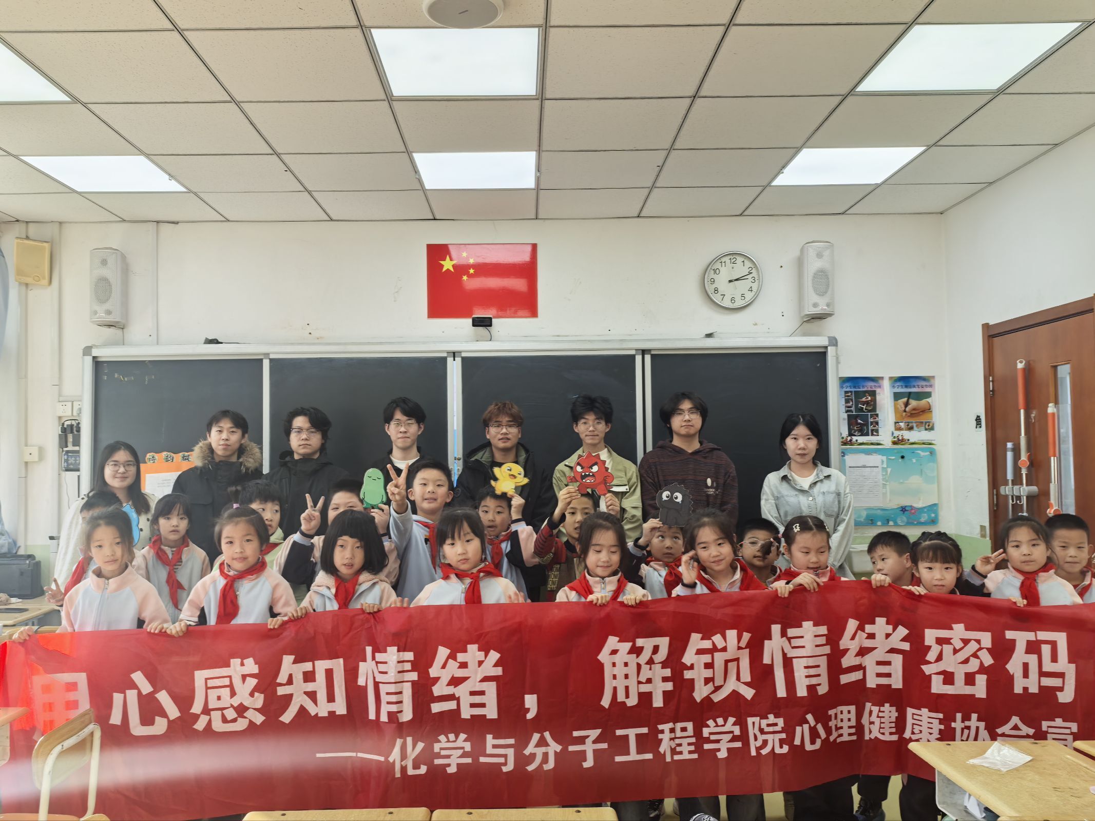 活动最后,志愿者与孩子们集体合影留念,定格下充满欢笑的瞬间。此次活动为校园科普与心理健康教育提供了新思路,化学院志愿者团队也将进一步总结经验,为后续志愿服务积累实践基础。