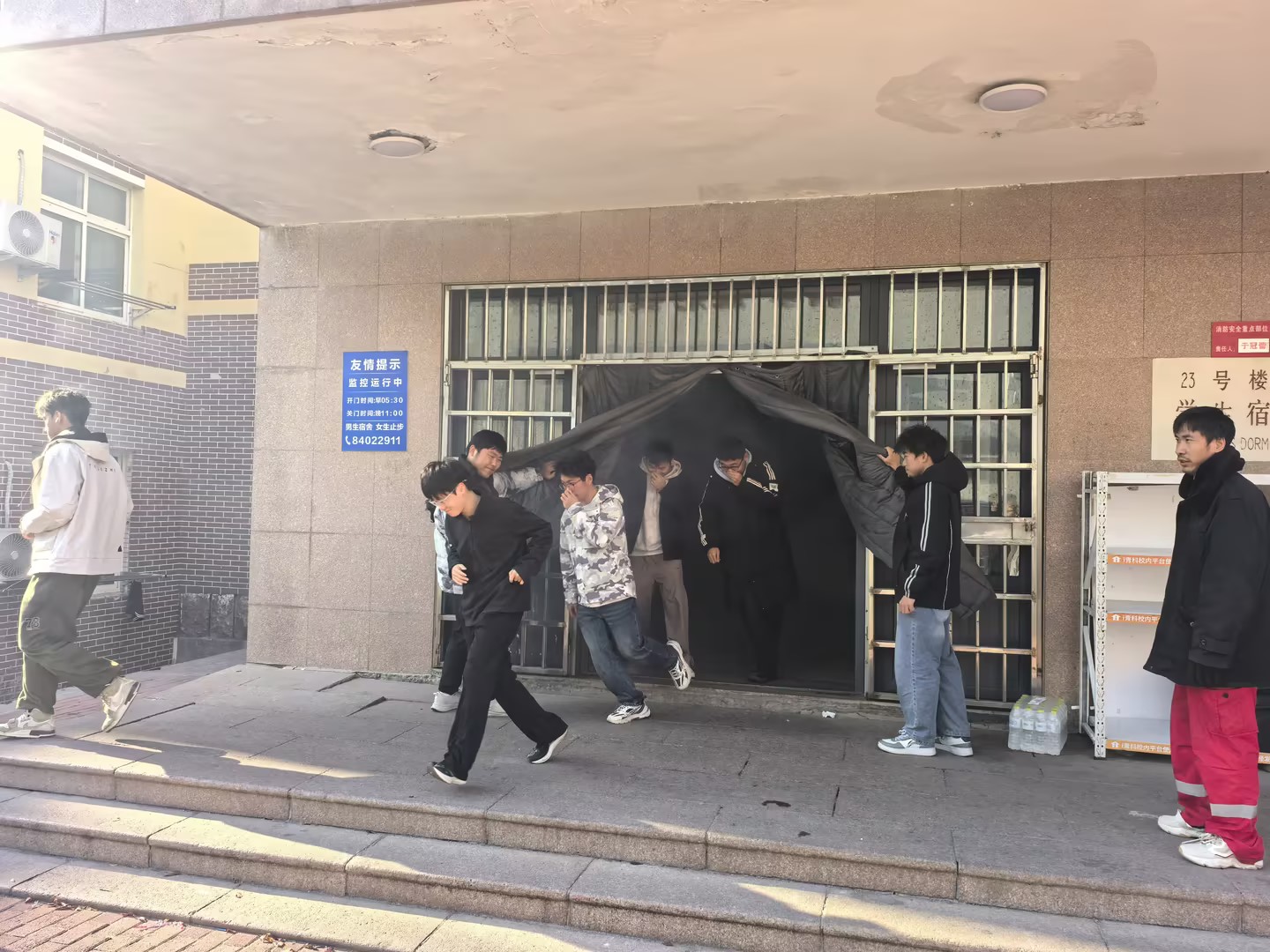 伴随着楼内烟雾警报,演练正式开始,同学们捂住口鼻,弯腰行走,在各楼引导员的指引下安全、有序的撤离到小五四广场,整个过程井然有序、高效规范。
