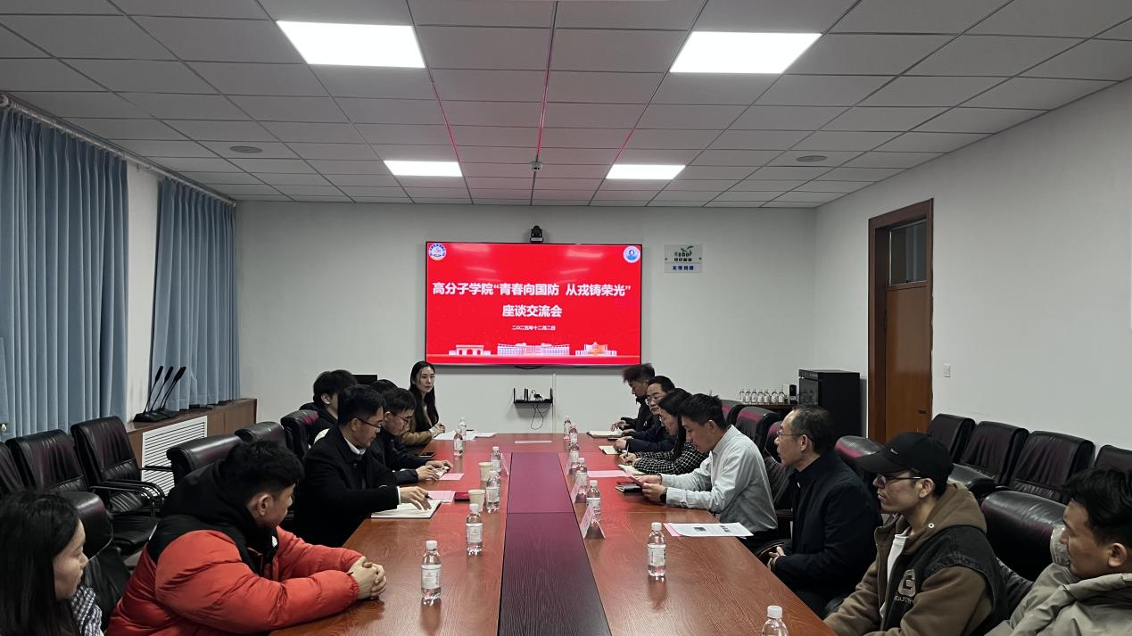 为进一步弘扬爱国主义精神,强化大学生国防观念,鼓励青年学子投身国防事业,12月2日下午,高分子学院在403会议室开展“青春向国防 从戎铸荣光”座谈交流会。党委学生工作部(武装部)副部长李春家、橡胶教研室肖建斌教授、辅导员发展中心主任孟祥伟、学院辅导员代表及2022级、2023级预征预储全体成员参加了本次活动。活动由高分子学院党委副书记兼副院长贾明明主持。