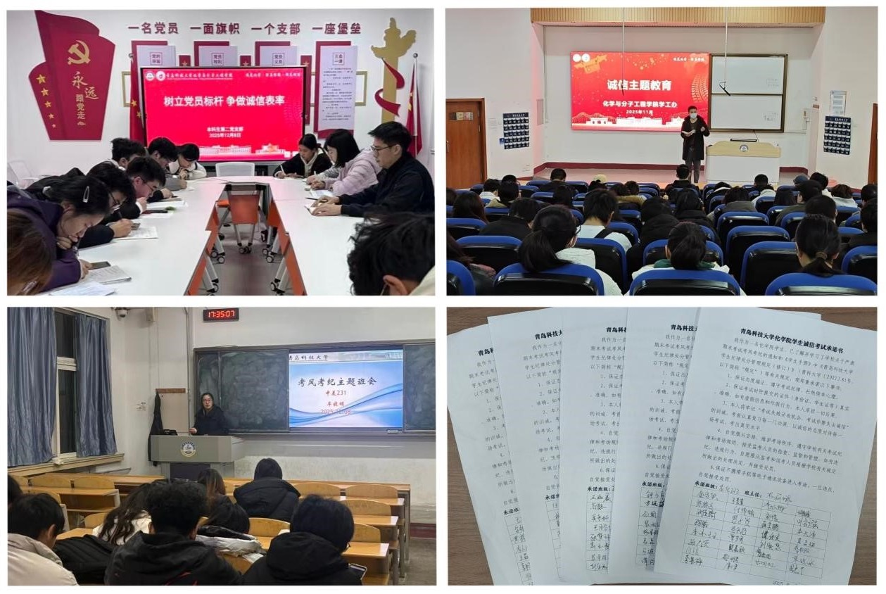 强化教育引导,筑牢诚信根基。化学院将考风建设融入思政育人体系,组织各班召开“诚信立身·诚信立学”主题班会,系统开展纪律教育、警示教育和价值教育。通过学习《青岛科技大学学生纪律处分管理规定》、典型案例剖析等形式,强化学生规则意识;结合《诚信考试承诺书》签署仪式、“诚信考场我先行”集体宣誓等环节,积极营造“以诺促行、以行践诺”的良好氛围。
