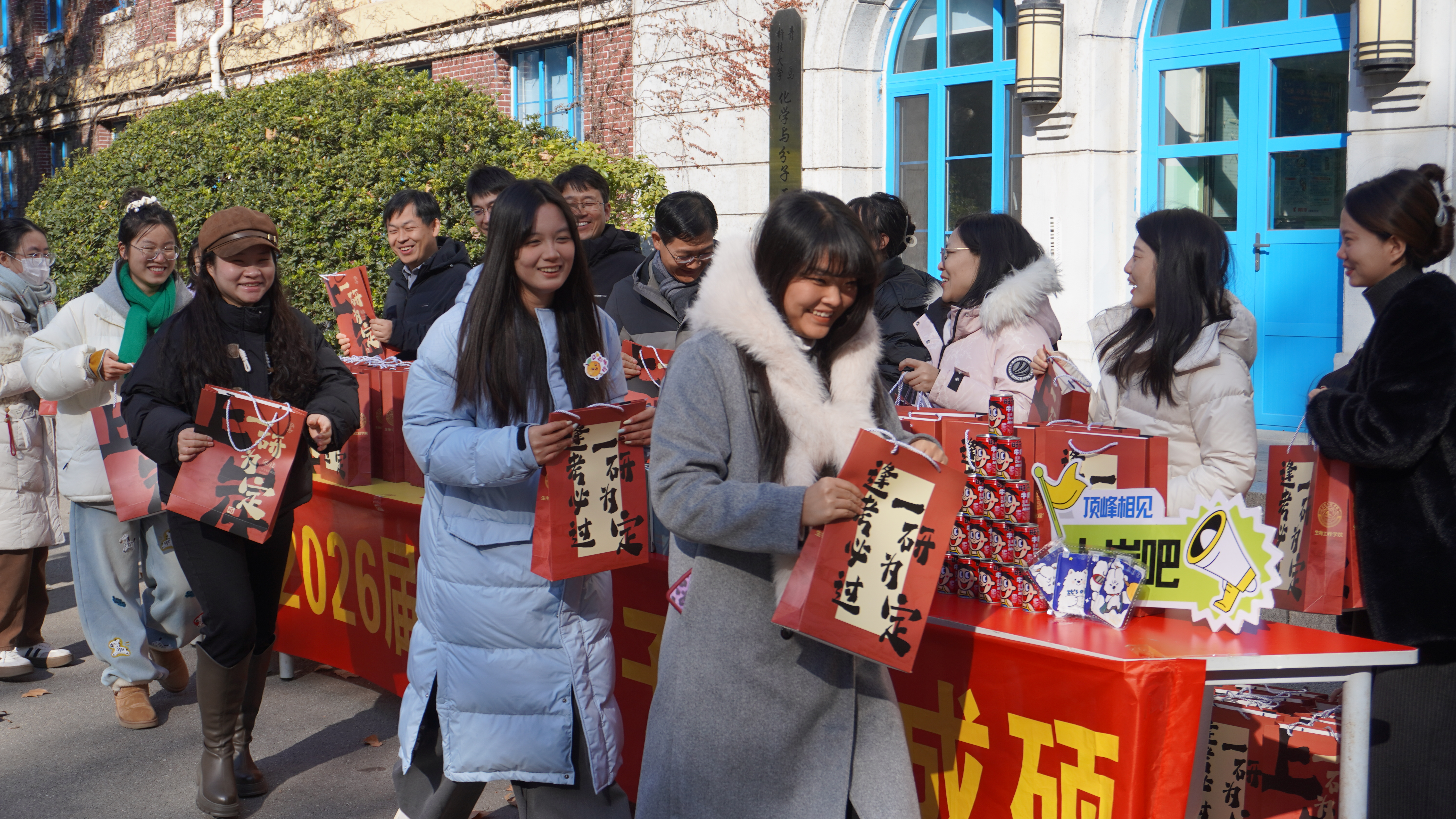 学院党委书记周宪锋、院长顾玉超、党委副书记兼副院长刘浩、副院长孟祥民、团委书记兼学工办主任秦洪庆及各年级辅导员、2022级班主任代表学院为2022级考研学子们分发礼包,这份“考研礼包”中藏着满满的“夺冠密码”:饱满橙子寓意着“橙风破浪,一举成硕”,愿学子们考场披荆斩棘、势不可当;香甜旺仔牛奶承载着“旺力全开,高分上岸”的祝福,盼大家发挥超常、实力爆棚;简约实用的笔记本,寄托着“笔耕不辍,研途笃行”的期许,愿学子们在逐梦路上沉淀每一份积累;贴心暖宝宝化身“备考铠甲”,为挑灯夜战的追梦人驱散寒意,守护每一份专注与坚守。学院始终关注考研学子的备考状态,此次礼包发放既是对大家坚持与付出的肯定,更是对学子们金榜题名的殷切期盼。