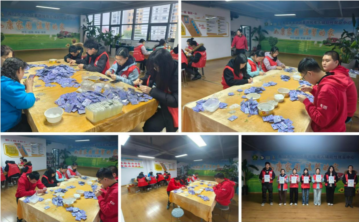 11月15日,青岛科技大学青年志愿者协会机电工程学院分会走进春雨残疾人辅助性就业中心,陪伴自闭症儿童制作耳钉。志愿者们手把手教孩子串珠、固定配件,轻声引导他们按颜色将一对对耳钉固定在纸板上。原本安静的教室,渐渐响起细碎的笑声——孩子举着完成的耳钉笑时,志愿者也看着他们染上了笑意。活动结束后,孩子们同志愿者们一起把打包好的耳钉装到箱子里,为第二天的售卖做好了准备。在此次志愿活动中,孩子们在志愿者的耐心陪伴和引导下,不仅锻炼了手眼协调能力,更在愉快的氛围中提升了社交主动性与任务专注度。